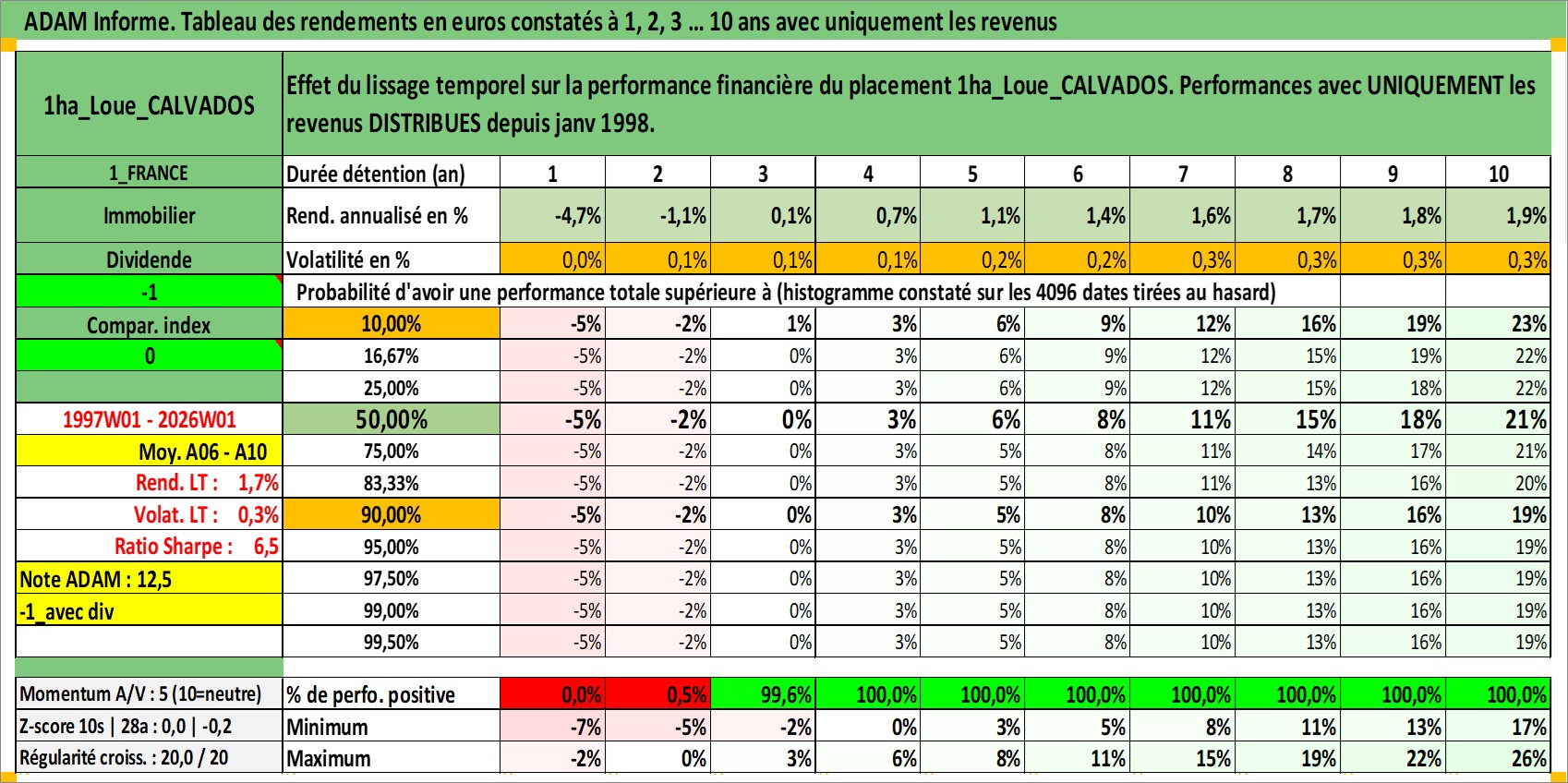 Site dédié aux investisseursPage dédiée sur site financeAnalyse des valorisations hebdomadaires de l'actif 1ha_Loue_CALVADOS. Cet actif est cote en EUR. Les valorisations couvrent les semaines 1997W01 a 2026W01. Les fermages de ce bien foncier sont pris egaux a 2,5% annuels de la valeur venale du bien.