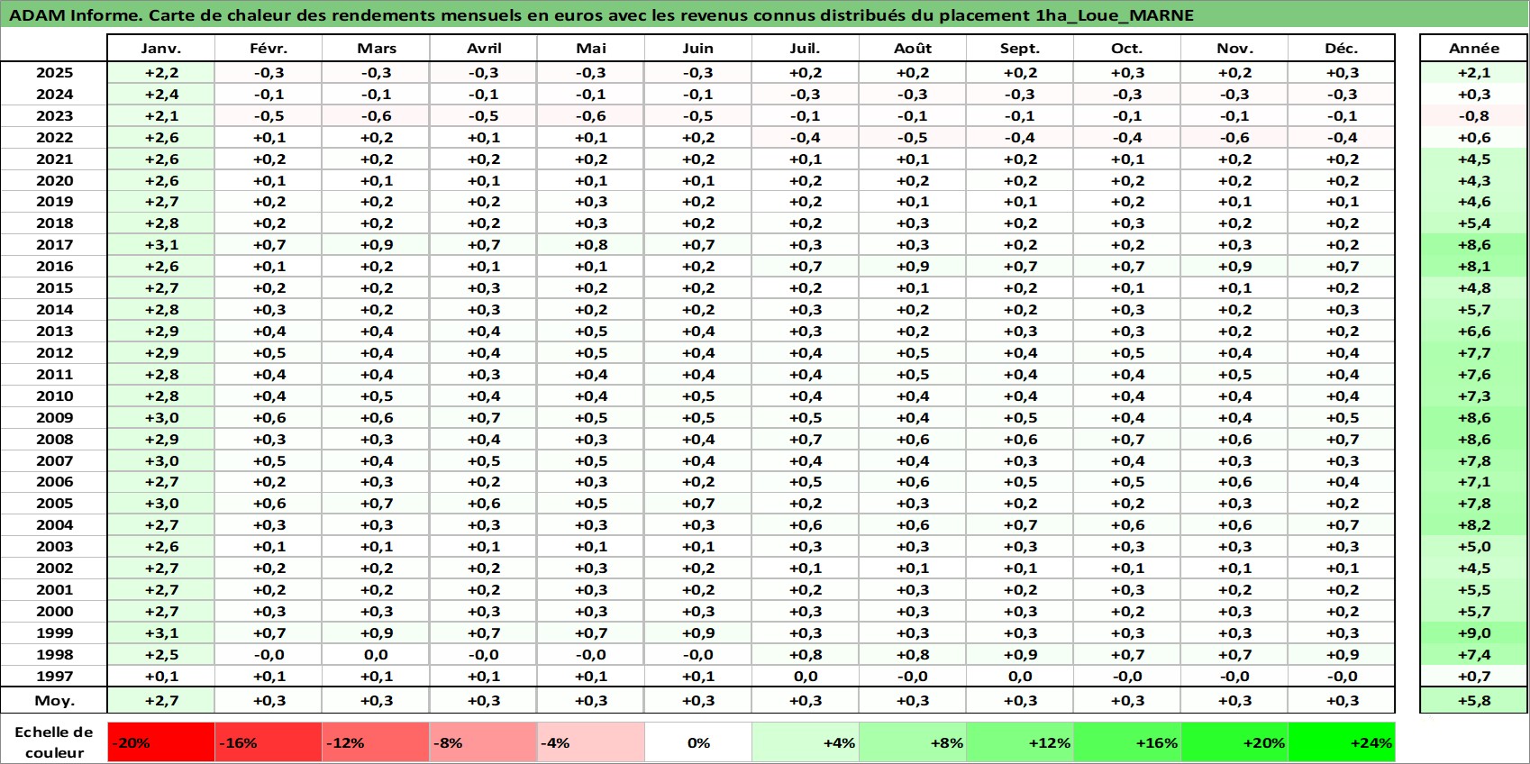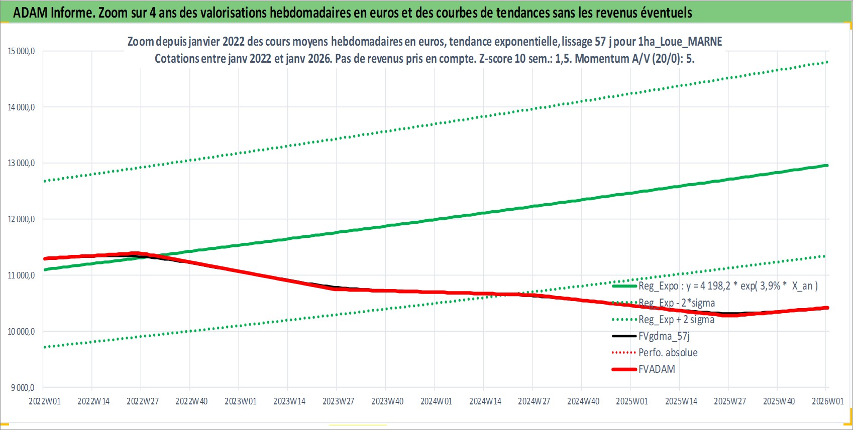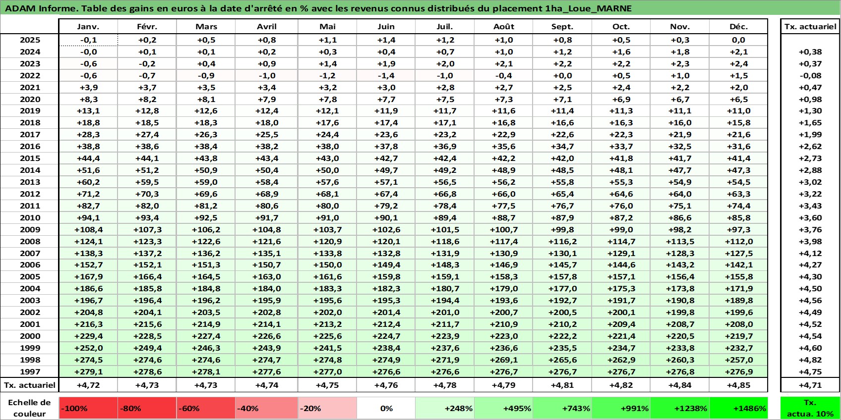 Site dédié aux investisseursPage dédiée sur site financeAnalyse des valorisations hebdomadaires de l'actif 1ha_Loue_MARNE. Cet actif est cote en EUR. Les valorisations couvrent les semaines 1997W01 a 2026W01. Les fermages de ce bien foncier sont pris egaux a 2,5% annuels de la valeur venale du bien.