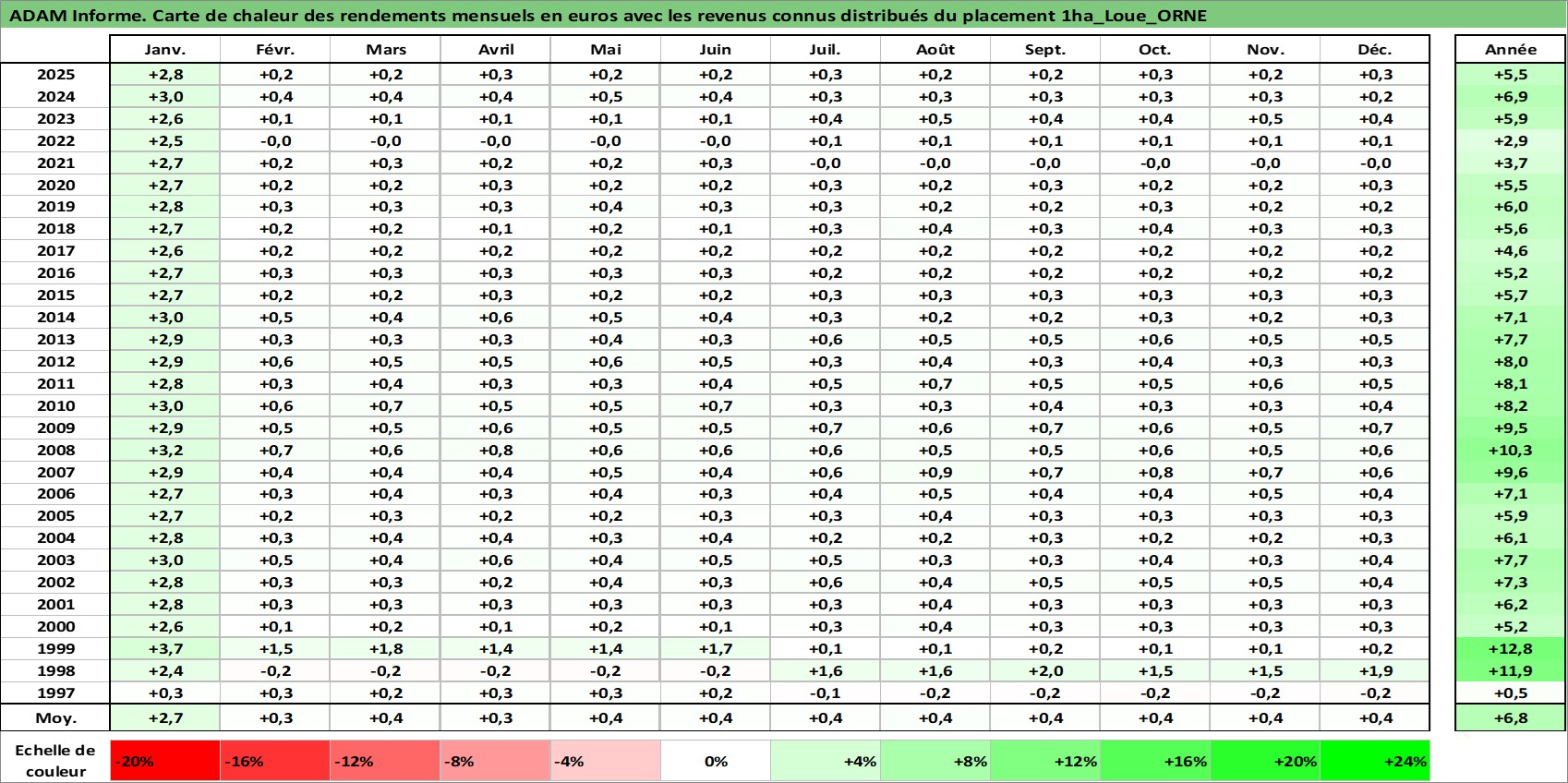 Site dédié aux investisseursPage dédiée sur site financeAnalyse des valorisations hebdomadaires de l'actif 1ha_Loue_ORNE. Cet actif est cote en EUR. Les valorisations couvrent les semaines 1997W01 a 2026W01. Les fermages de ce bien foncier sont pris egaux a 2,5% annuels de la valeur venale du bien.