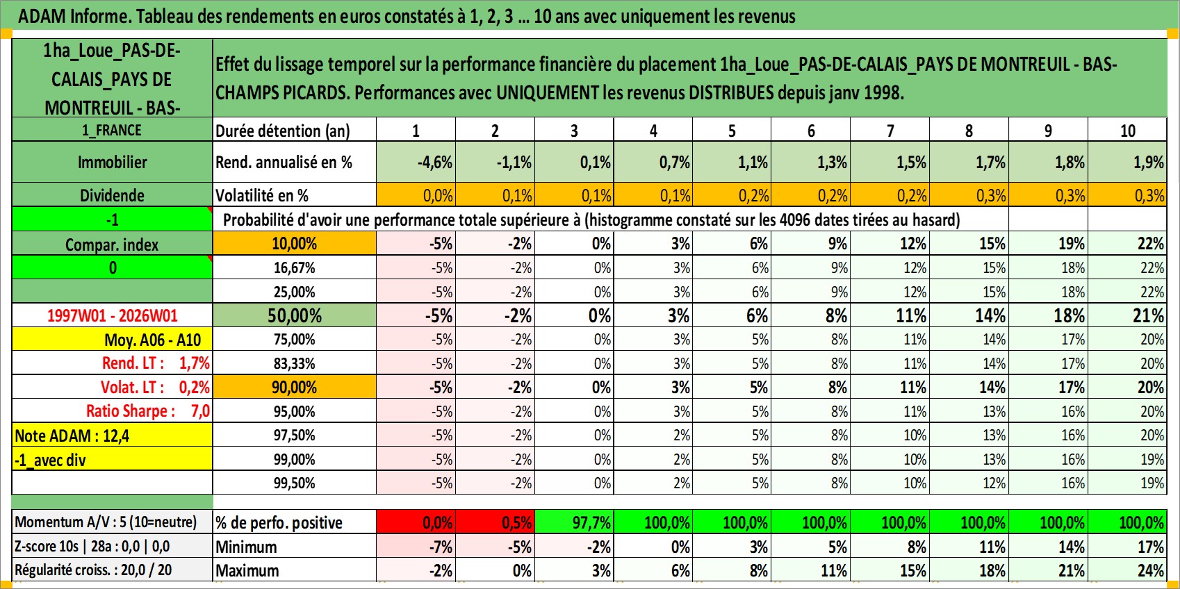 Site dédié aux investisseursPage dédiée sur site financeAnalyse des valorisations hebdomadaires de l'actif 1ha_Loue_PAS-DE-CALAIS_PAYS DE MONTREUIL - BAS-CHAMPS PICARDS. Cet actif est cote en EUR. Les valorisations couvrent les semaines 1997W01 a 2026W01. Les fermages de ce bien foncier sont pris egaux a 2,5% annuels de la valeur venale du bien.