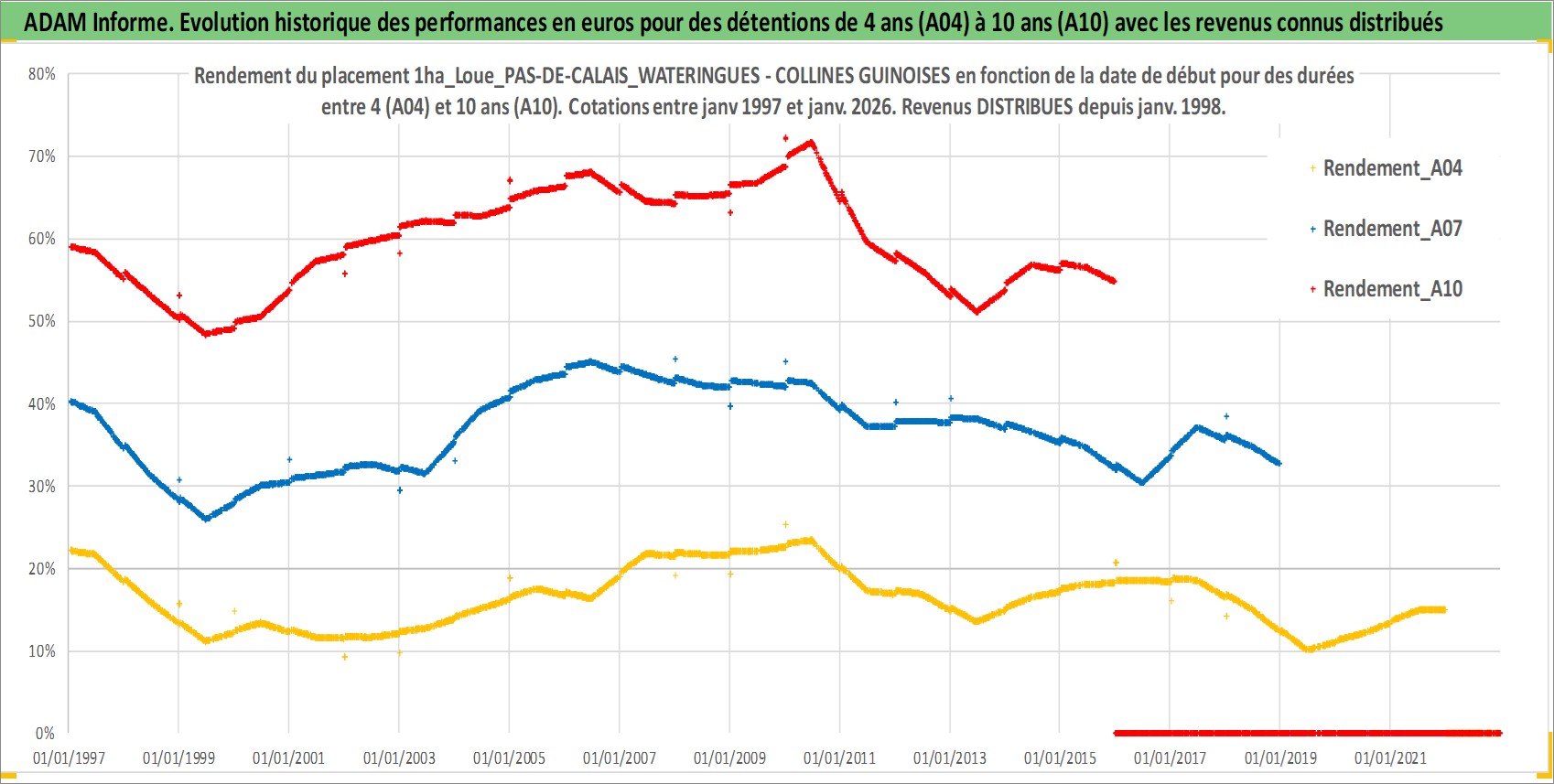 Site dédié aux investisseursPage dédiée sur site financeAnalyse des valorisations hebdomadaires de l'actif 1ha_Loue_PAS-DE-CALAIS_WATERINGUES - COLLINES GUINOISES. Cet actif est cote en EUR. Les valorisations couvrent les semaines 1997W01 a 2026W01. Les fermages de ce bien foncier sont pris egaux a 2,5% annuels de la valeur venale du bien.