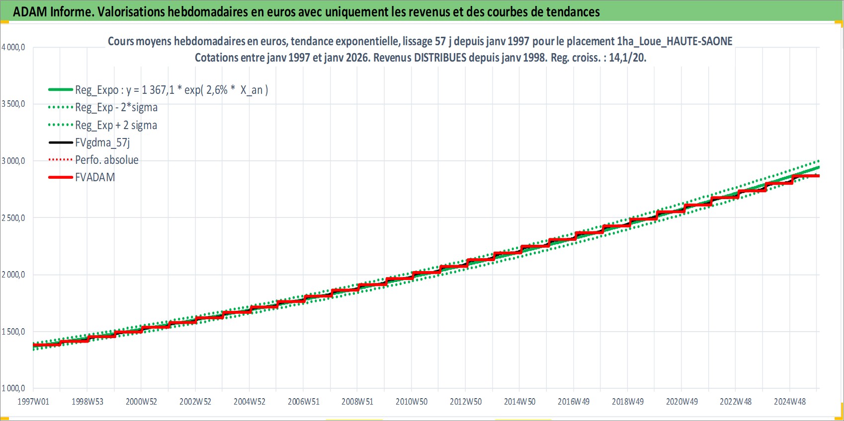 Site dédié aux investisseursPage dédiée sur site financeAnalyse des valorisations hebdomadaires de l'actif 1ha_Loue_HAUTE-SAONE. Cet actif est cote en EUR. Les valorisations couvrent les semaines 1997W01 a 2026W01. Les fermages de ce bien foncier sont pris egaux a 2,5% annuels de la valeur venale du bien.