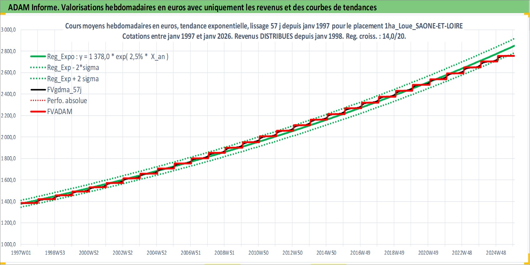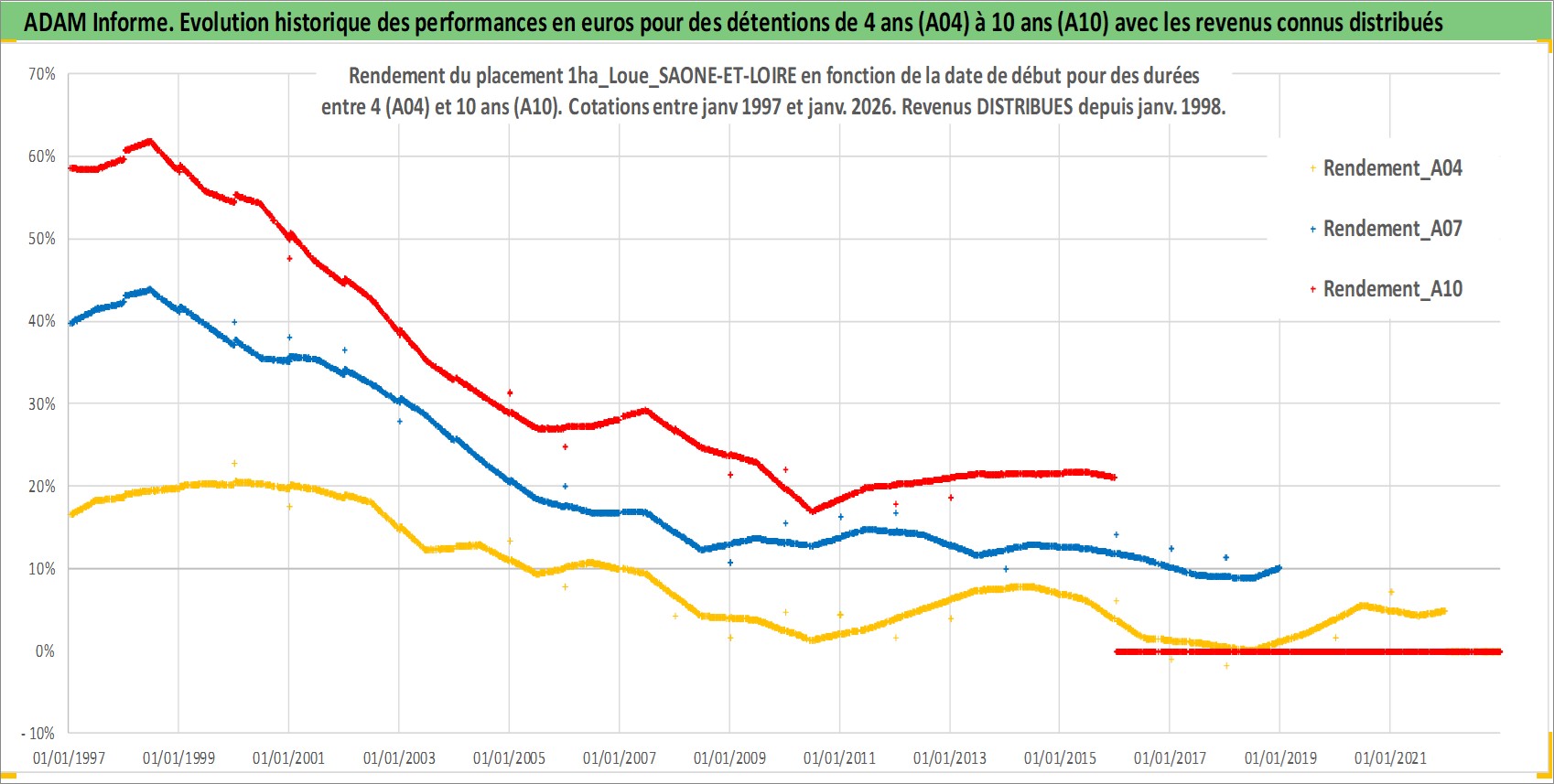 Site dédié aux investisseursPage dédiée sur site financeAnalyse des valorisations hebdomadaires de l'actif 1ha_Loue_SAONE-ET-LOIRE. Cet actif est cote en EUR. Les valorisations couvrent les semaines 1997W01 a 2026W01. Les fermages de ce bien foncier sont pris egaux a 2,5% annuels de la valeur venale du bien.
