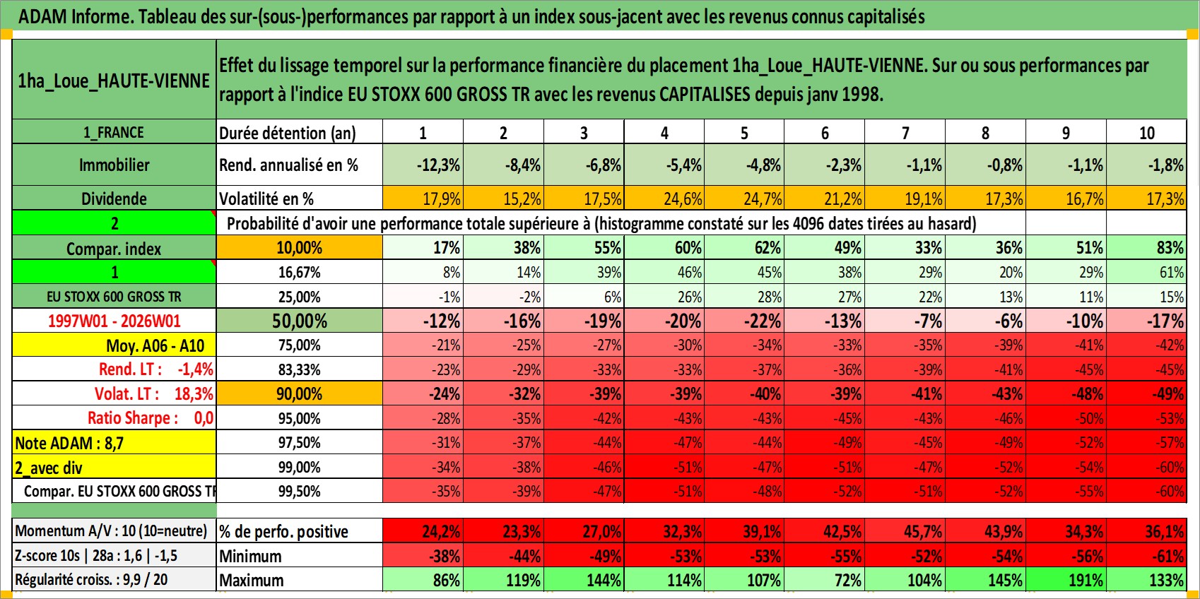 Site dédié aux investisseursPage dédiée sur site financeAnalyse des valorisations hebdomadaires de l'actif 1ha_Loue_HAUTE-VIENNE. Cet actif est cote en EUR. Les valorisations couvrent les semaines 1997W01 a 2026W01. Les fermages de ce bien foncier sont pris egaux a 2,5% annuels de la valeur venale du bien.