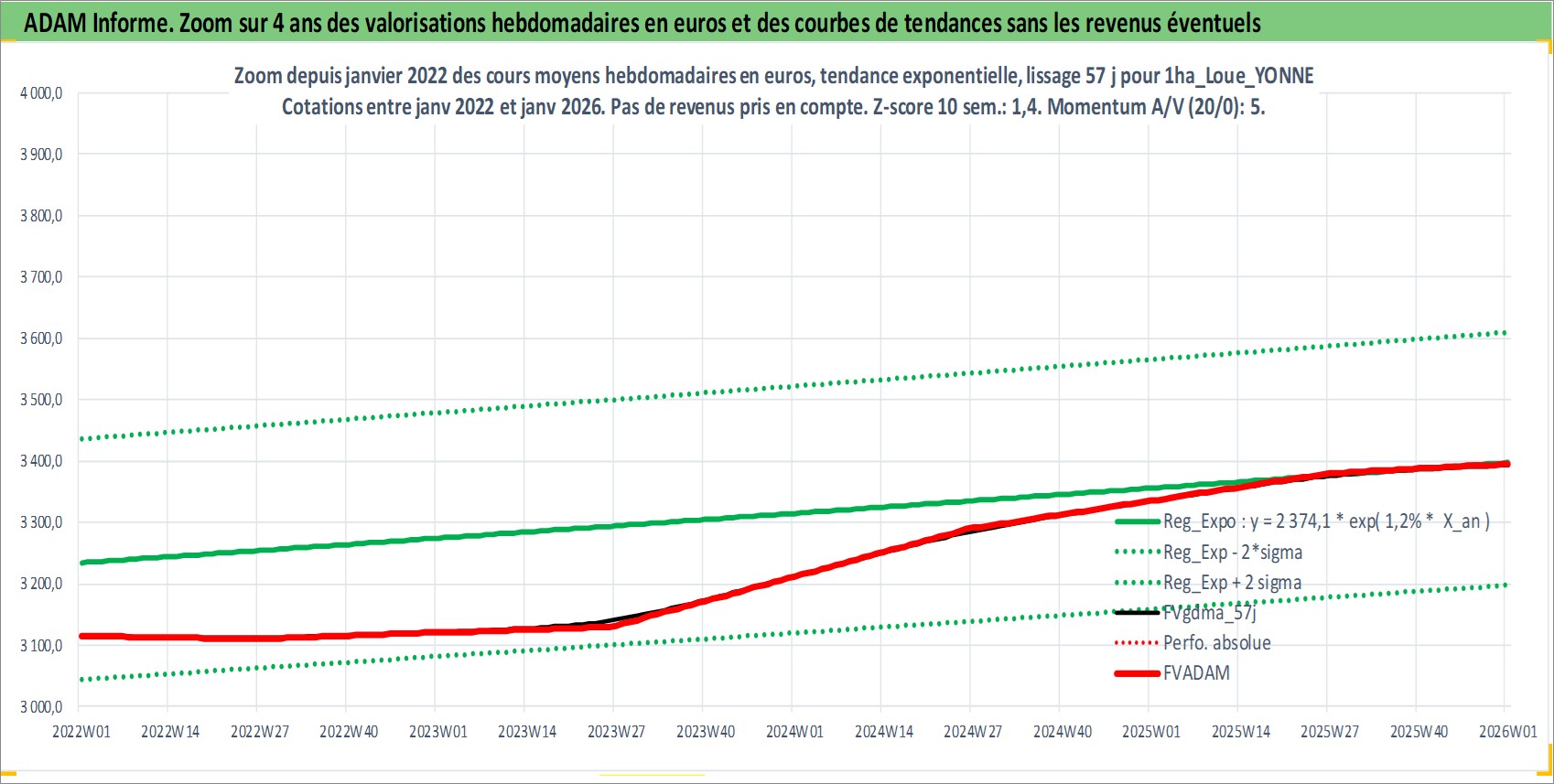Site dédié aux investisseursPage dédiée sur site financeAnalyse des valorisations hebdomadaires de l'actif 1ha_Loue_YONNE. Cet actif est cote en EUR. Les valorisations couvrent les semaines 1997W01 a 2026W01. Les fermages de ce bien foncier sont pris egaux a 2,5% annuels de la valeur venale du bien.