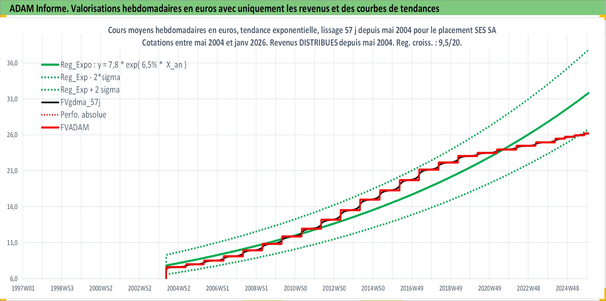 Site dédié aux investisseursPage dédiée sur site financeAnalyse des valorisations hebdomadaires de l'action SES SA. Cet actif est cote en EUR. Les valorisations couvrent les semaines 2004W19 a 2026W01. Les revenus de cet actif financier sont pris en compte depuis la semaine 2004W21. La note globale ESG de cet actif est estimee a 12.0 (apres rebasage entre 0 et 20).