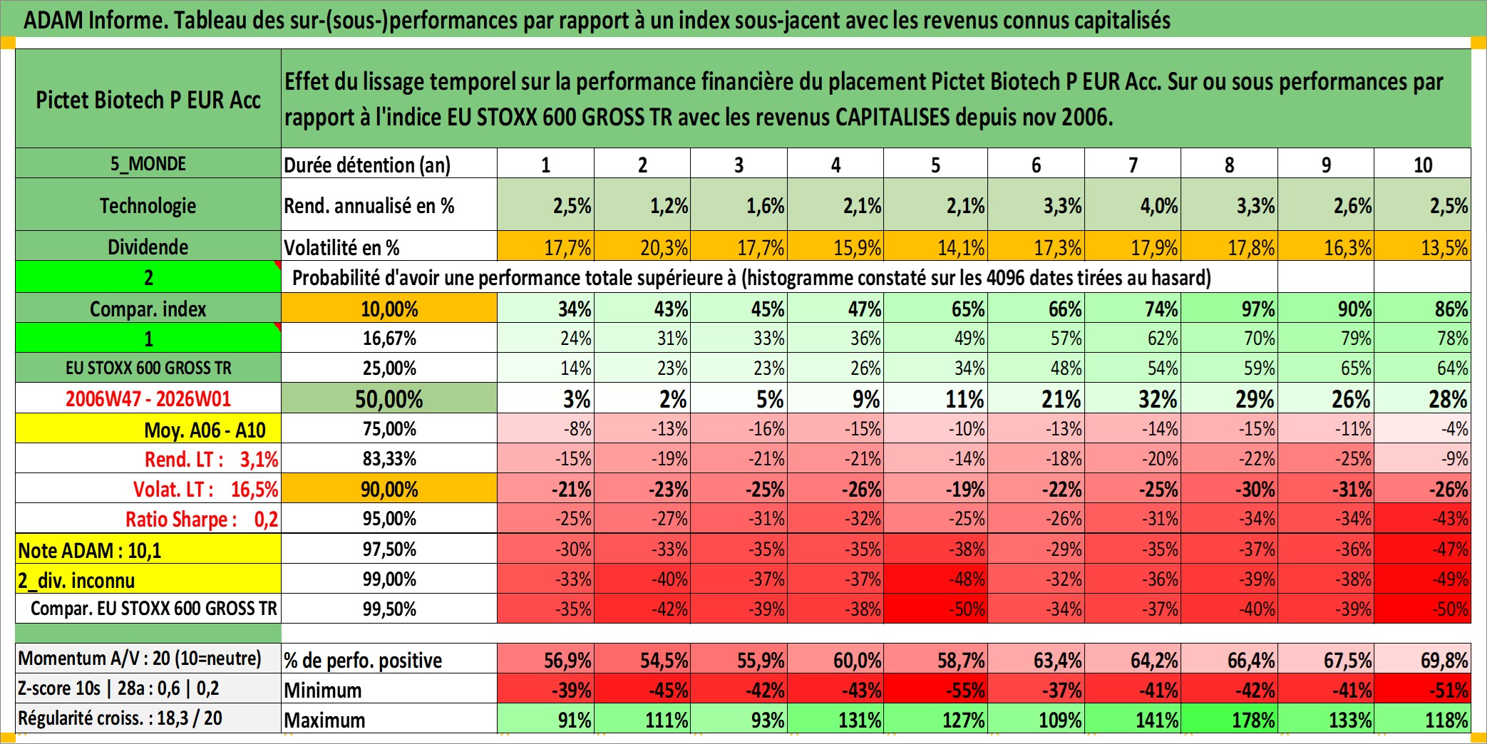 Site dédié aux investisseursPage dédiée sur site financeAnalyse des valorisations hebdomadaires du fonds Pictet Biotech P EUR Acc. Cet actif est cote en EUR. Les valorisations couvrent les semaines 2006W47 a 2026W01. Les revenus de cet actif financier sont pris en compte depuis la semaine 2006W47. La note globale ESG de cet actif est estimee a 5.0 (apres rebasage entre 0 et 20).