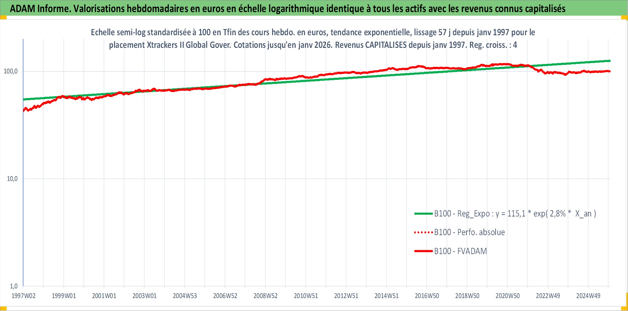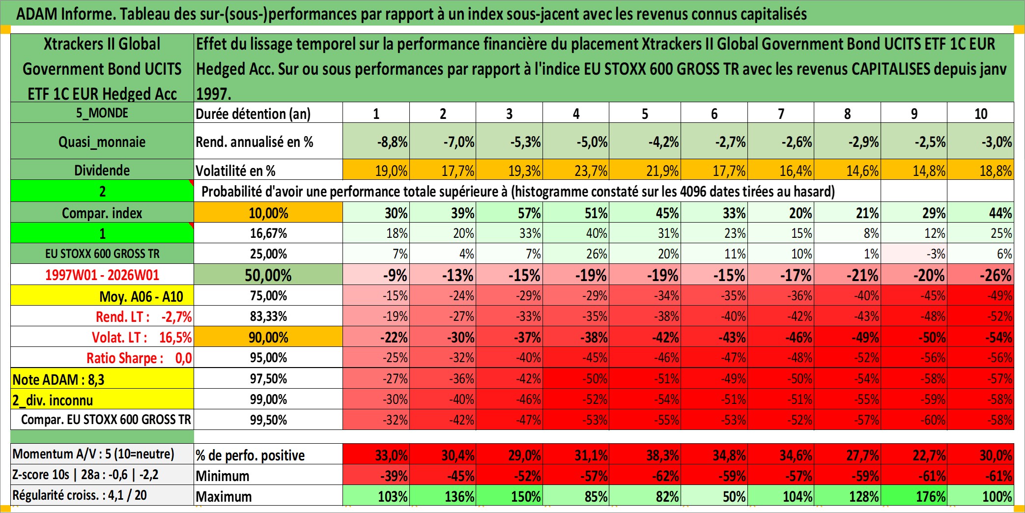 Site dédié aux investisseursPage dédiée sur site financeAnalyse des valorisations hebdomadaires du fonds Xtrackers II Global Government Bond UCITS ETF 1C EUR Hedged Acc. Cet actif est cote en EUR. Les valorisations couvrent les semaines 1997W01 a 2026W01. Les revenus de cet actif financier sont pris en compte depuis la semaine 1997W01. La note ESG de cet actif n'est pas connue.