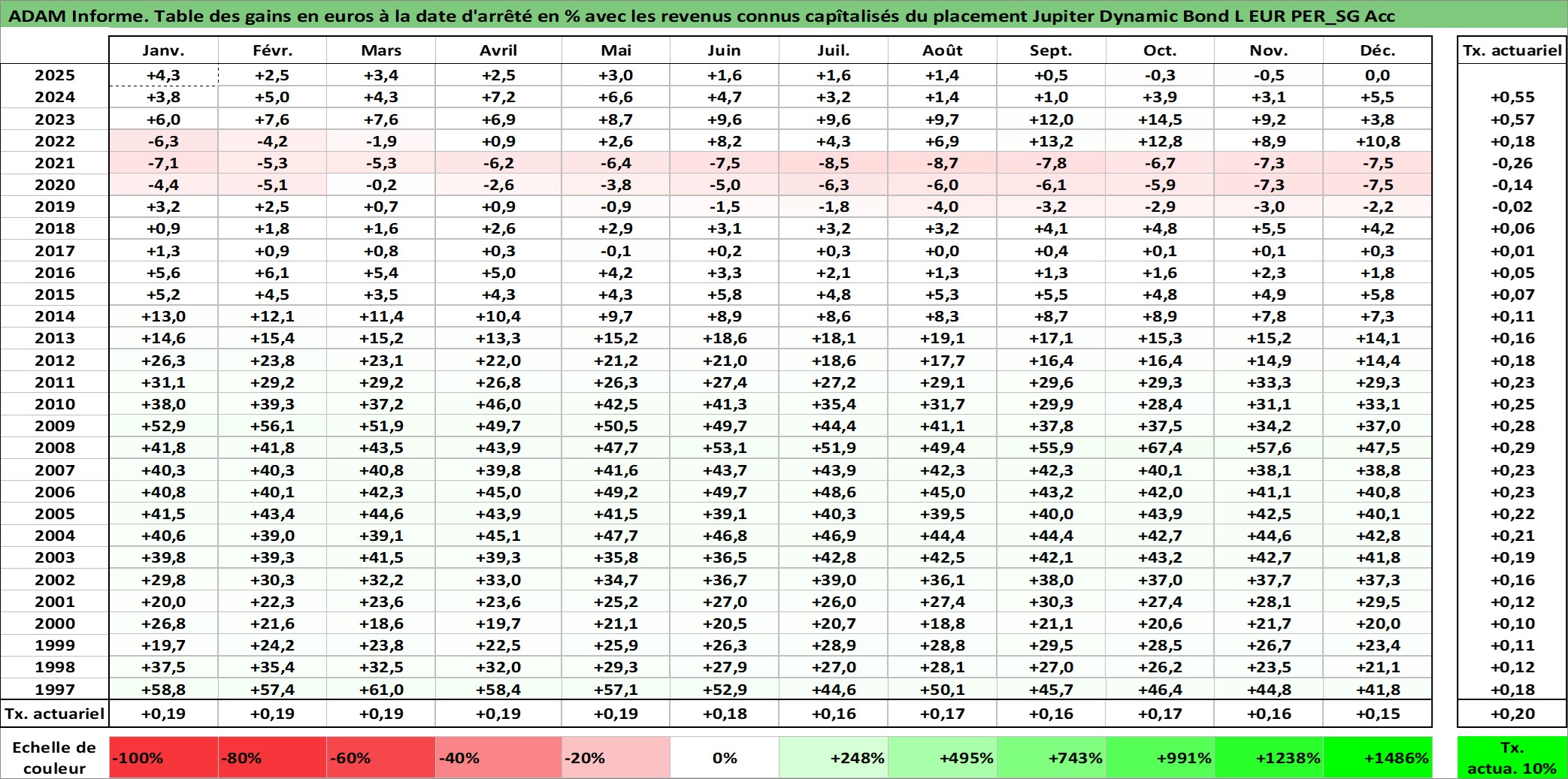 Site dédié aux investisseursPage dédiée sur site financeAnalyse des valorisations hebdomadaires du fonds Jupiter Dynamic Bond L EUR PER_SG Acc. Cet actif est cote en EUR. Les valorisations couvrent les semaines 1997W01 a 2026W01. Les revenus de cet actif financier sont pris en compte depuis la semaine 1997W01. La note ESG de cet actif n'est pas connue.