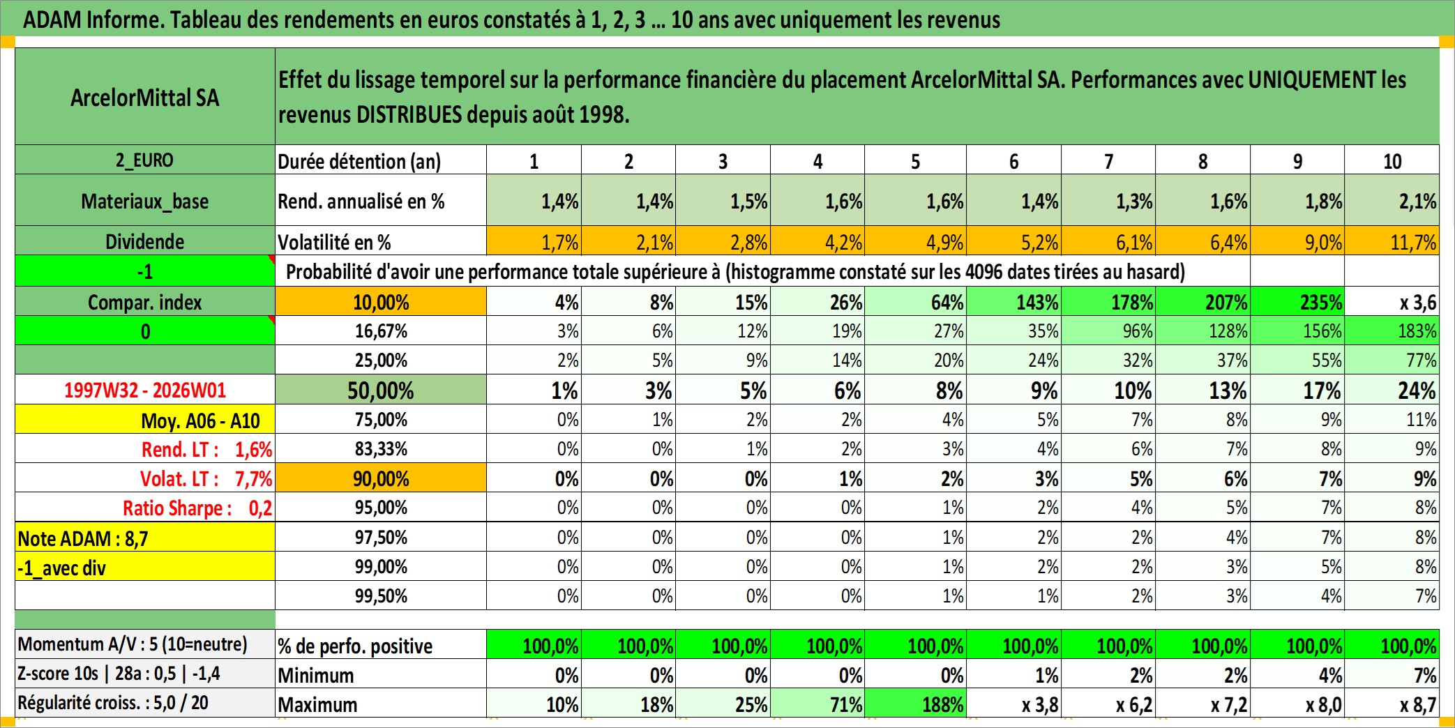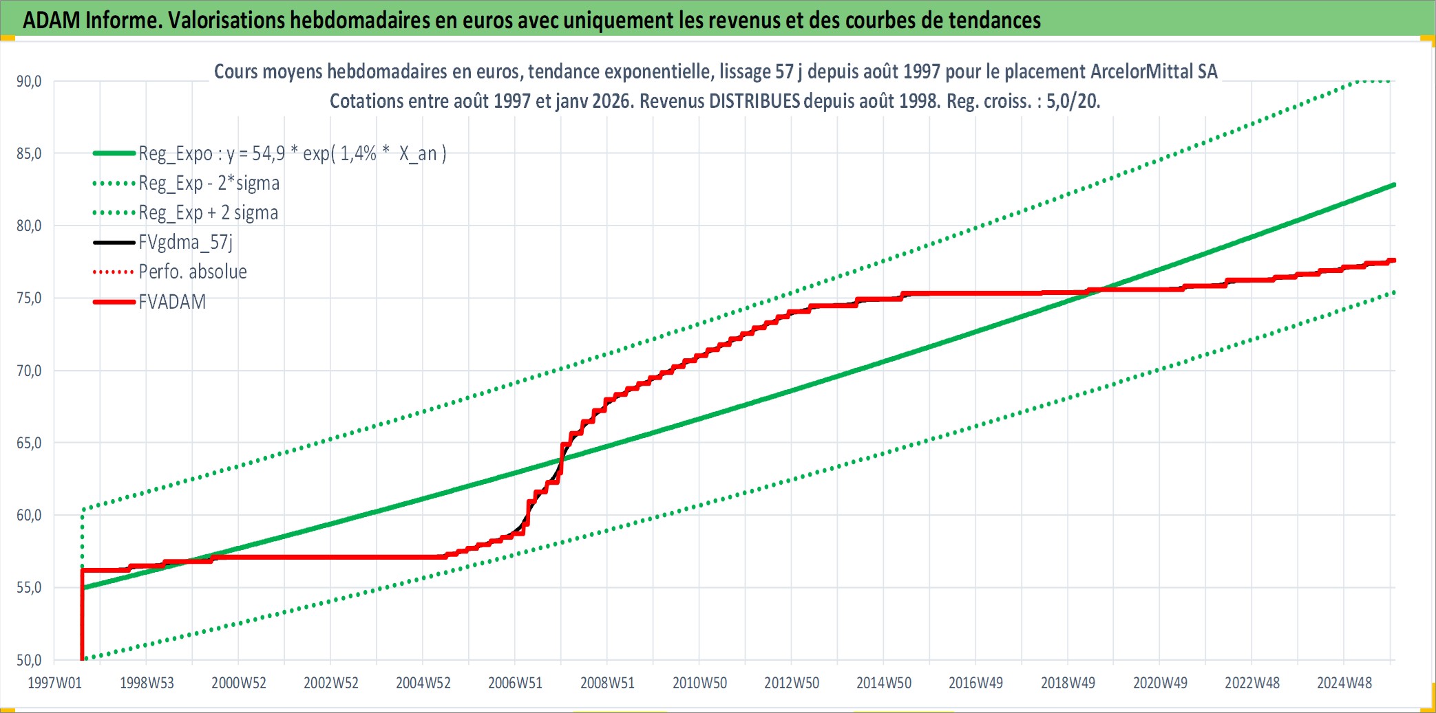 Site dédié aux investisseursPage dédiée sur site financeAnalyse des valorisations hebdomadaires de l'action ArcelorMittal SA. Cet actif est cote en EUR. Les valorisations couvrent les semaines 1997W32 a 2026W01. Les revenus de cet actif financier sont pris en compte depuis la semaine 1998W34. La note globale ESG de cet actif est estimee a 3.0 (apres rebasage entre 0 et 20).