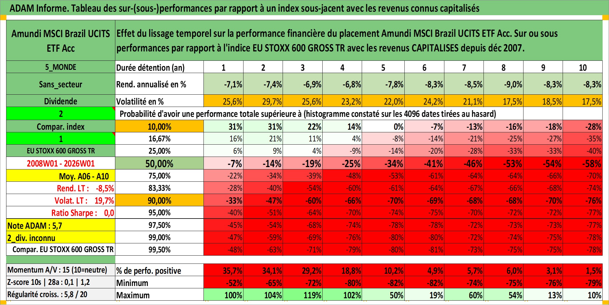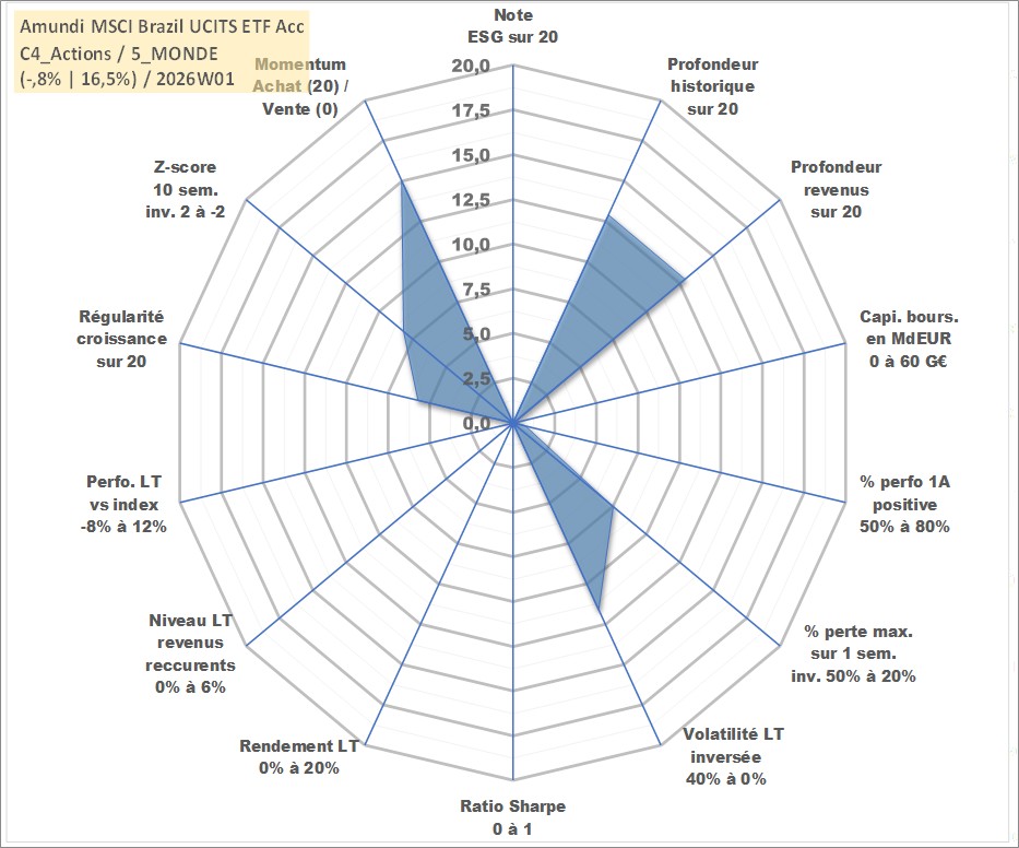 Site dédié aux investisseursPage dédiée sur site financeAnalyse des valorisations hebdomadaires du fonds Amundi MSCI Brazil UCITS ETF Acc. Cet actif est cote en EUR. Les valorisations couvrent les semaines 2008W01 a 2026W01. Les revenus de cet actif financier sont pris en compte depuis la semaine 2008W01. La note ESG de cet actif n'est pas connue.