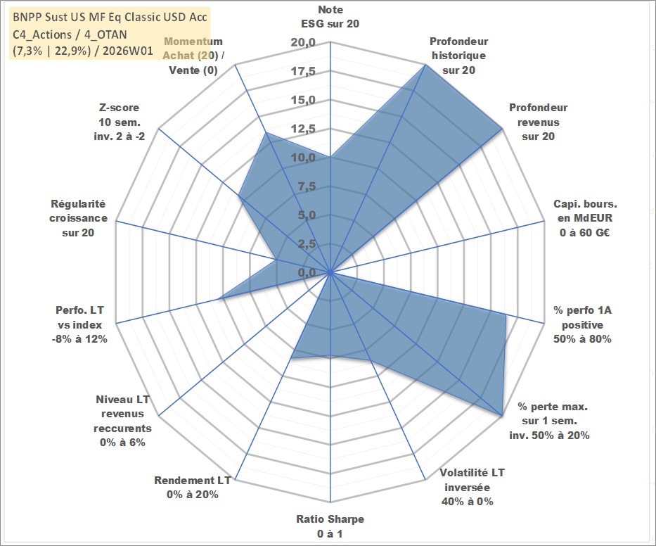 Site dédié aux investisseursPage dédiée sur site financeAnalyse des valorisations hebdomadaires du fonds BNPP Sust US MF Eq Classic USD Acc. Cet actif est cote en USD. Les valorisations sont en contrevaleur EURO et couvrent les semaines 1997W01 a 2026W01. Les revenus de cet actif financier sont pris en compte depuis la semaine 1997W01. La note globale ESG de cet actif est estimee a 10.0 (apres rebasage entre 0 et 20).