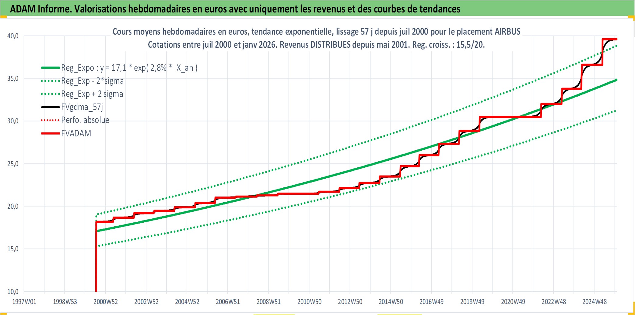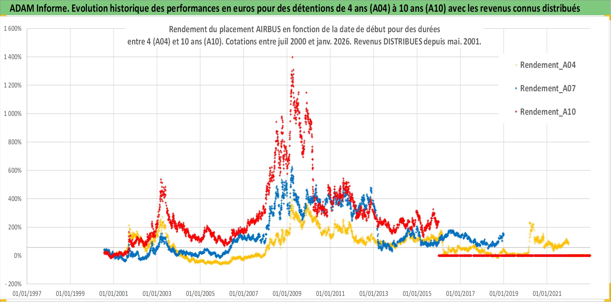 Site dédié aux investisseursPage dédiée sur site financeAnalyse des valorisations hebdomadaires de l'action AIRBUS. Cet actif est cote en EUR. Les valorisations couvrent les semaines 2000W28 a 2026W01. Les revenus de cet actif financier sont pris en compte depuis la semaine 2001W20. La note globale ESG de cet actif est estimee a 7.0 (apres rebasage entre 0 et 20).