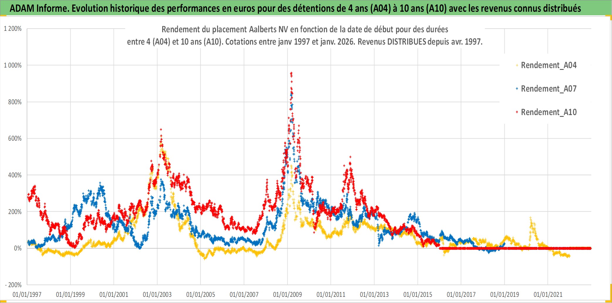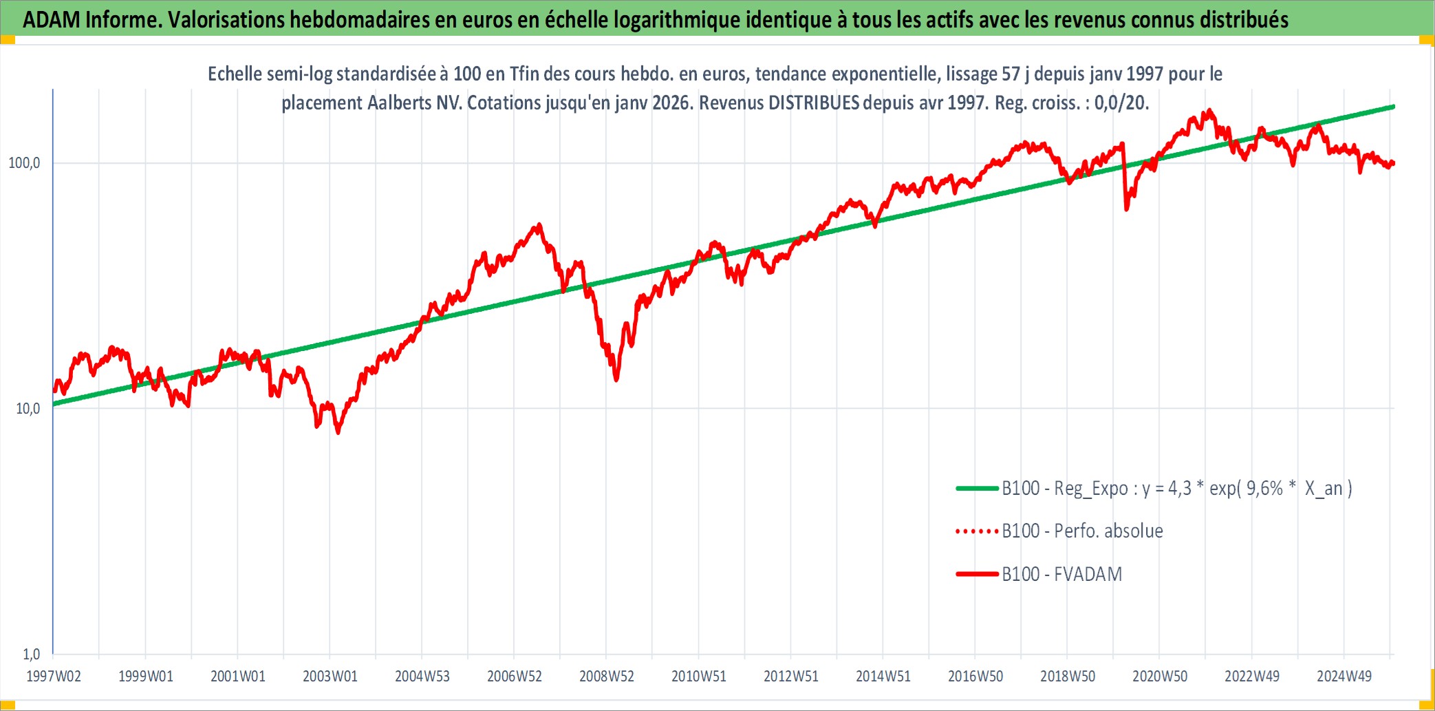 Site dédié aux investisseursPage dédiée sur site financeAnalyse des valorisations hebdomadaires de l'action Aalberts NV. Cet actif est cote en EUR. Les valorisations couvrent les semaines 1997W01 a 2026W01. Les revenus de cet actif financier sont pris en compte depuis la semaine 1997W16. La note ESG de cet actif n'est pas connue.