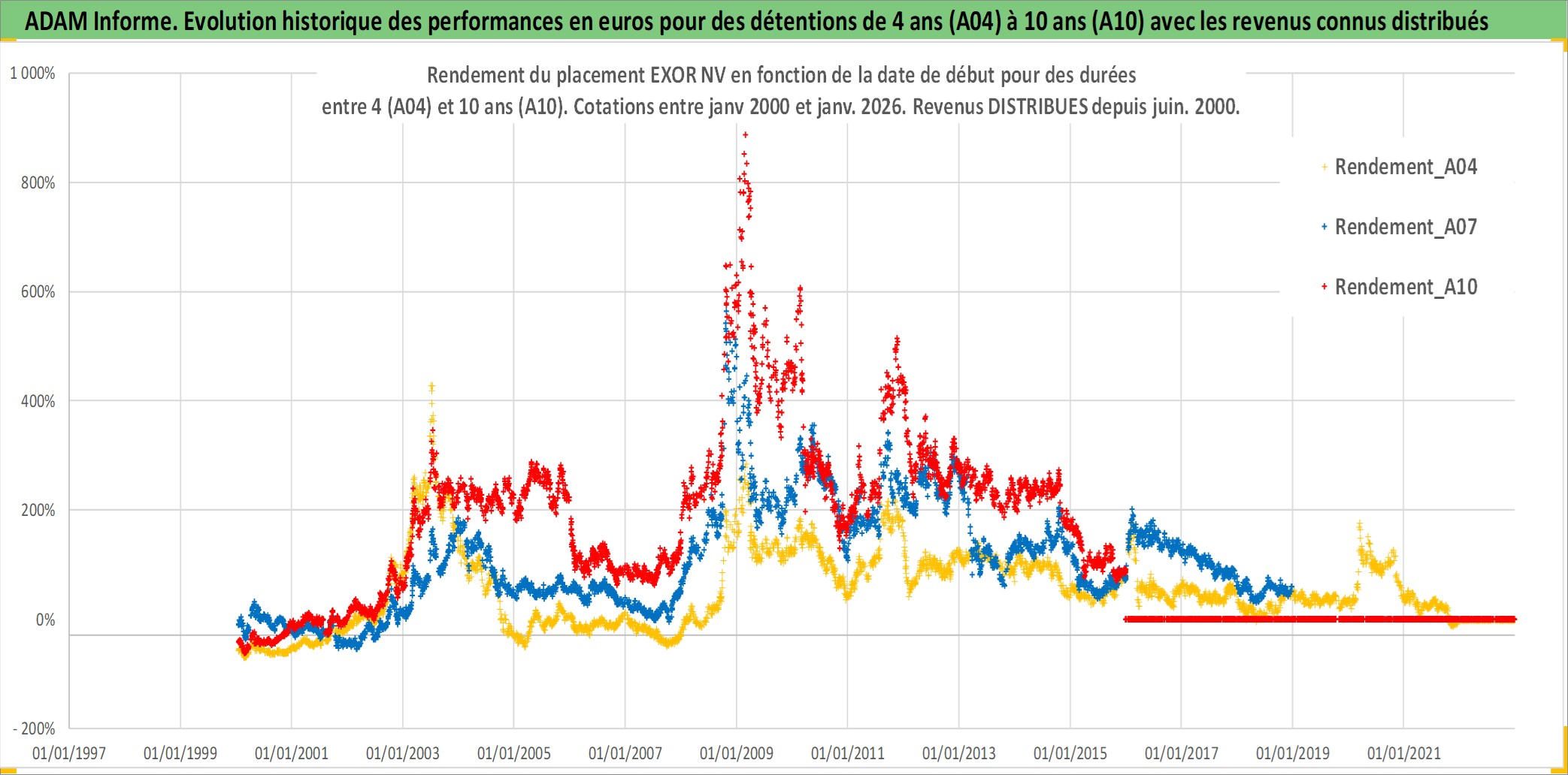 Site dédié aux investisseursPage dédiée sur site financeAnalyse des valorisations hebdomadaires de l'action EXOR NV. Cet actif est cote en EUR. Les valorisations couvrent les semaines 2000W01 a 2026W01. Les revenus de cet actif financier sont pris en compte depuis la semaine 2000W25. La note globale ESG de cet actif est estimee a 15.0 (apres rebasage entre 0 et 20).