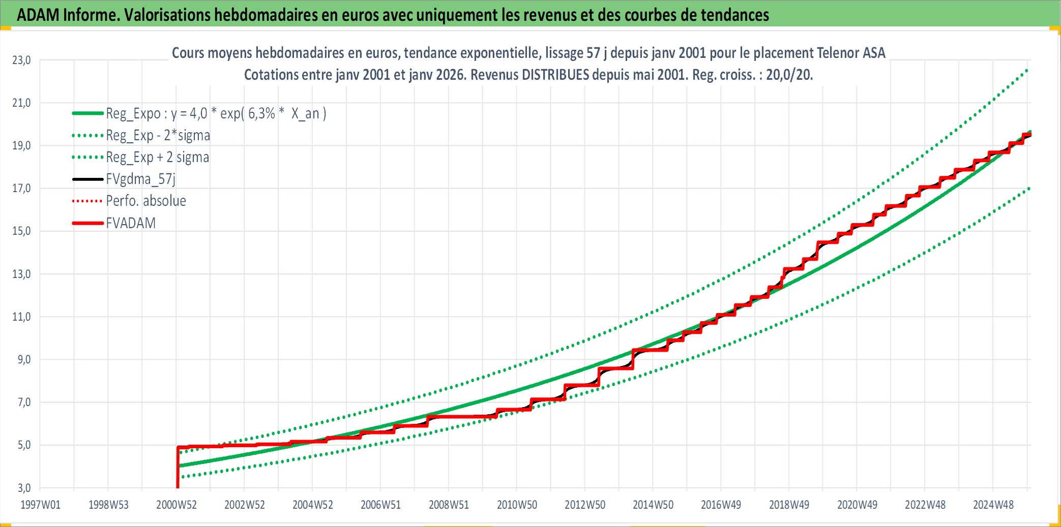 Site dédié aux investisseursPage dédiée sur site financeAnalyse des valorisations hebdomadaires de l'action Telenor ASA. Cet actif est cote en NOK. Les valorisations sont en contrevaleur EURO et couvrent les semaines 2001W02 a 2026W01. Les revenus de cet actif financier sont pris en compte depuis la semaine 2001W19. La note globale ESG de cet actif est estimee a 9.0 (apres rebasage entre 0 et 20).