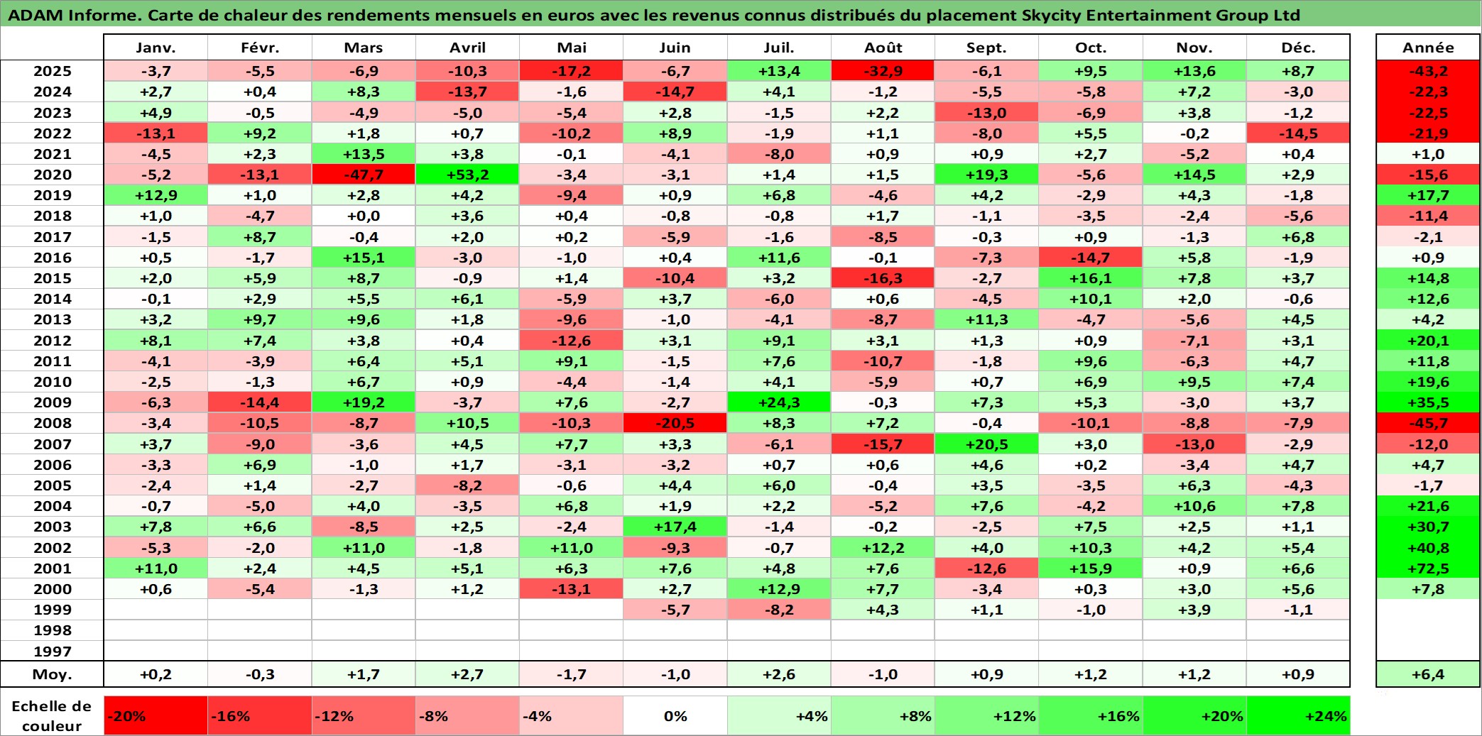 Site dédié aux investisseursPage dédiée sur site financeAnalyse des valorisations hebdomadaires de l'action Skycity Entertainment Group Ltd. Cet actif est cote en AUD. Les valorisations sont en contrevaleur EURO et couvrent les semaines 1999W18 a 2026W01. Les revenus de cet actif financier sont pris en compte depuis la semaine 2000W09. La note ESG de cet actif n'est pas connue.