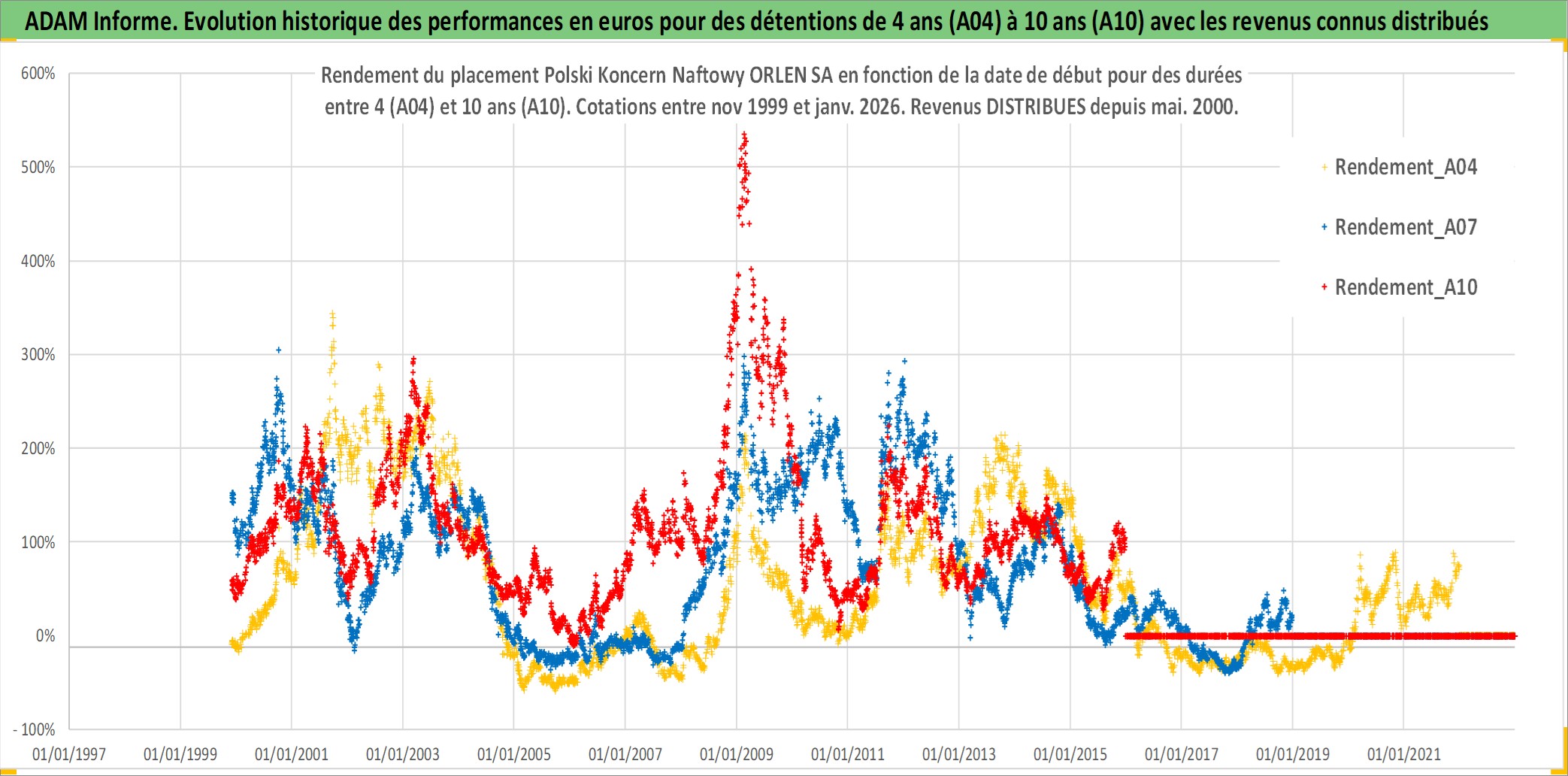 Site dédié aux investisseursPage dédiée sur site financeAnalyse des valorisations hebdomadaires de l'action Polski Koncern Naftowy ORLEN SA. Cet actif est cote en PLN. Les valorisations sont en contrevaleur EURO et couvrent les semaines 1999W47 a 2026W01. Les revenus de cet actif financier sont pris en compte depuis la semaine 2000W22. La note globale ESG de cet actif est estimee a 7.0 (apres rebasage entre 0 et 20).