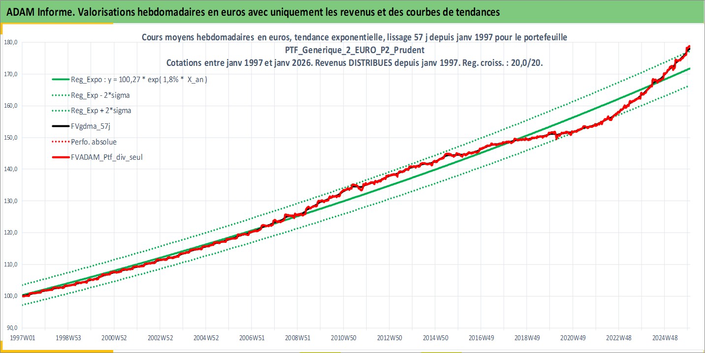 Site dédié aux investisseursPage dédiée sur site financeAnalyse des valorisations hebdomadaires du portefeuille PTF_Generique_2_EURO_P2_Prudent_8actifs avec un profil P2_Prudent. Ce portefeuille est cote en EUR. Les valorisations couvrent les semaines 1997W01 a 2026W01. Les revenus de cet actif financier sont pris en compte depuis la semaine 1997W01. La note ESG de cet actif n'est pas connue.
