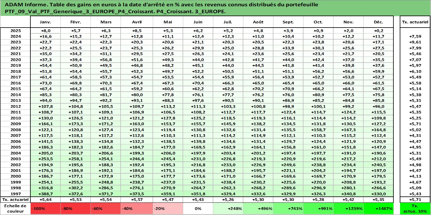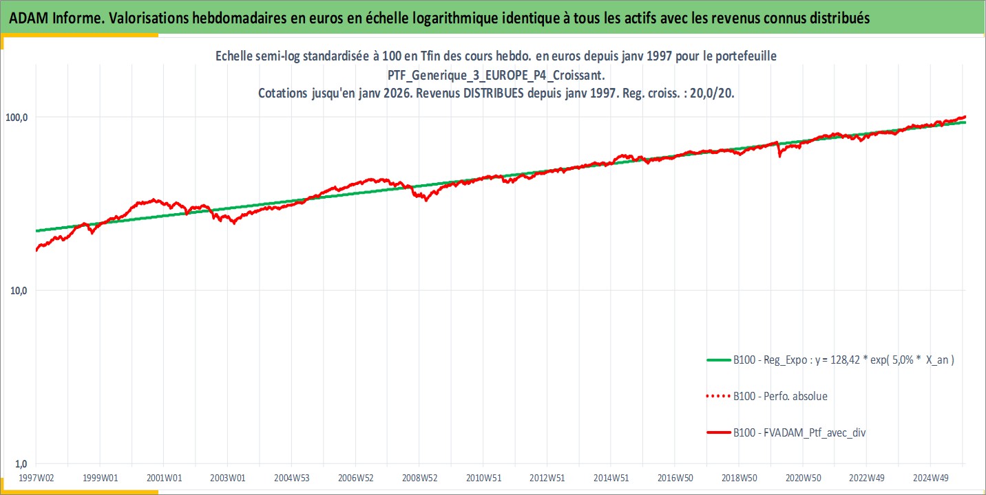 Site dédié aux investisseursPage dédiée sur site financeAnalyse des valorisations hebdomadaires du portefeuille PTF_Generique_3_EUROPE_P4_Croissant_9actifs avec un profil P4_Croissant. Ce portefeuille est cote en EUR. Les valorisations couvrent les semaines 1997W01 a 2026W01. Les revenus de cet actif financier sont pris en compte depuis la semaine 1997W01. La note ESG de cet actif n'est pas connue.
