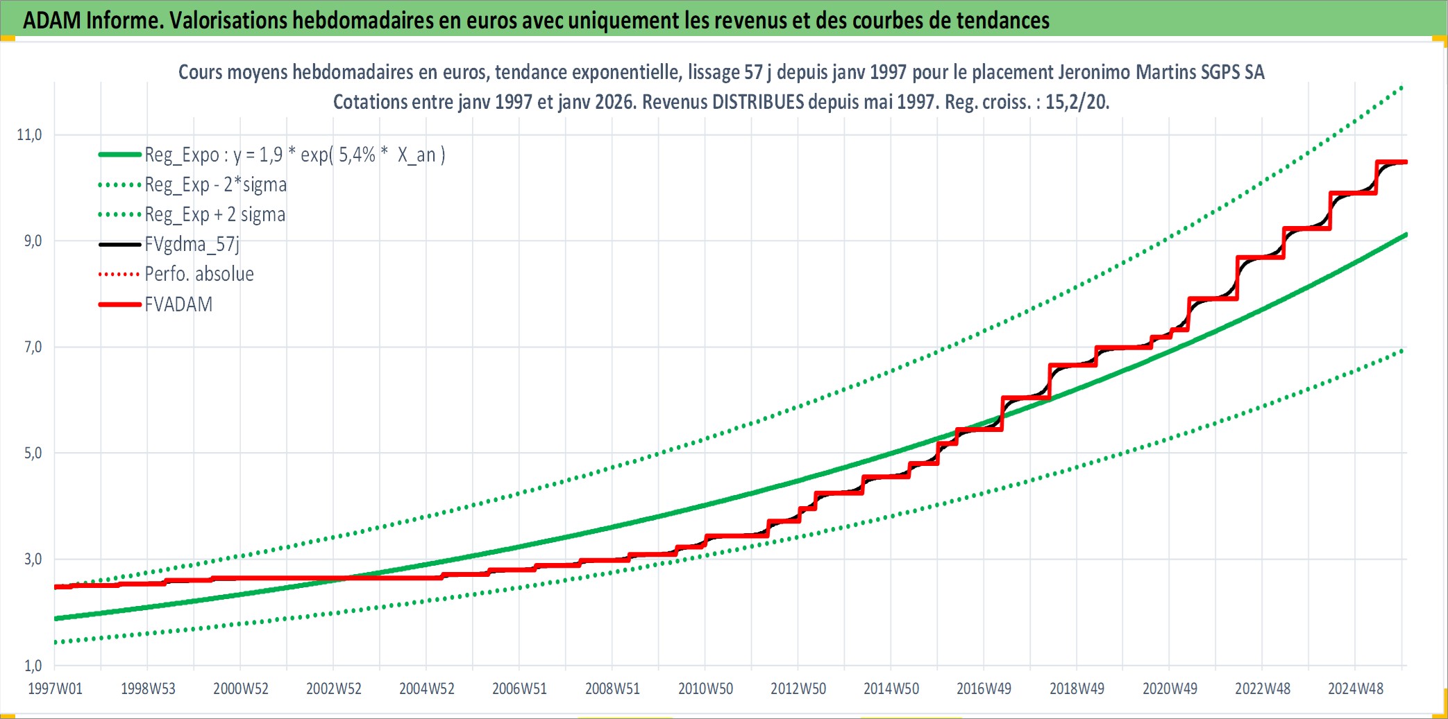 Site dédié aux investisseursPage dédiée sur site financeAnalyse des valorisations hebdomadaires de l'action Jeronimo Martins SGPS SA. Cet actif est cote en EUR. Les valorisations couvrent les semaines 1997W01 a 2026W01. Les revenus de cet actif financier sont pris en compte depuis la semaine 1997W20. La note globale ESG de cet actif est estimee a 14.0 (apres rebasage entre 0 et 20).