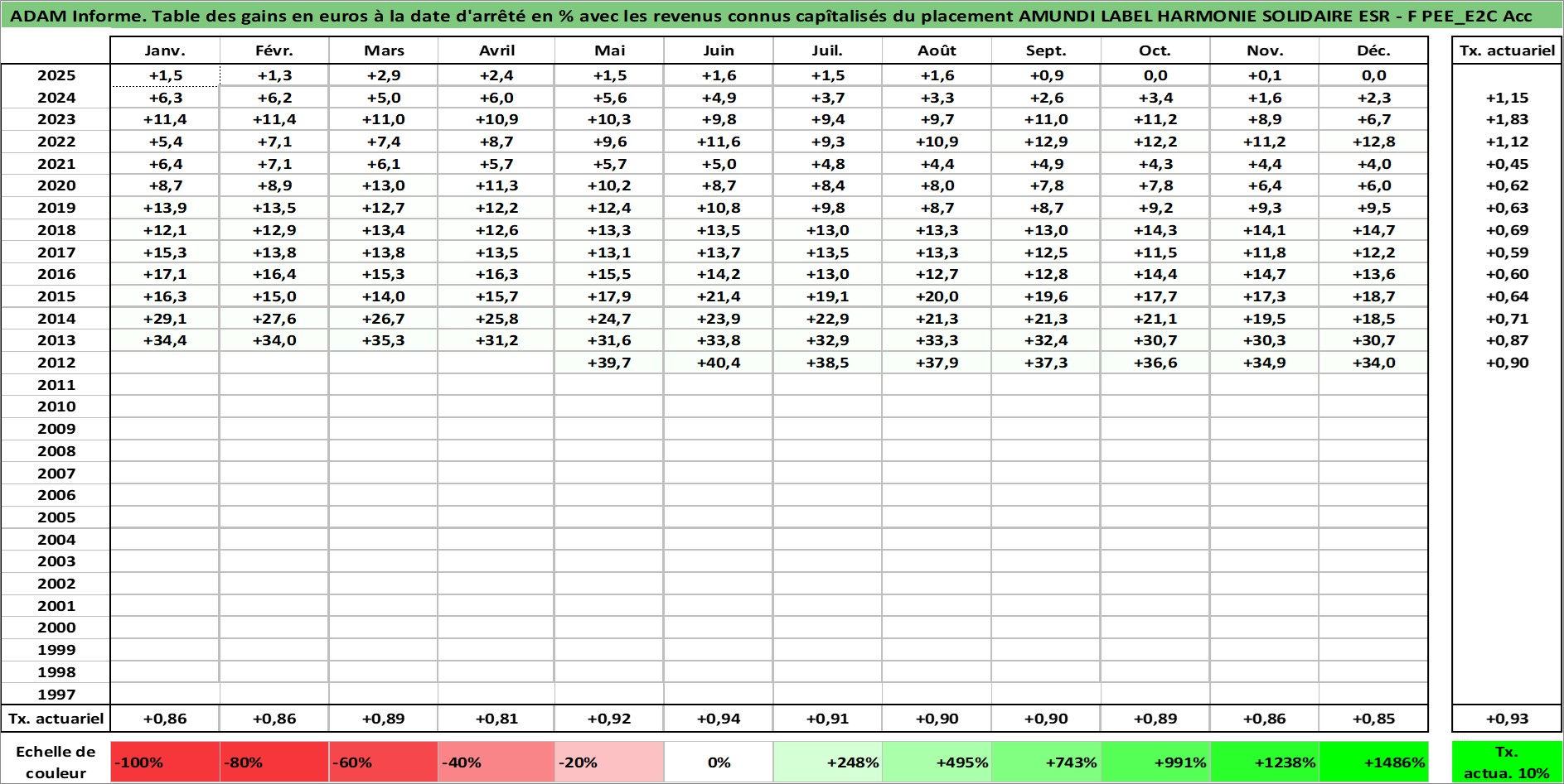 Site dédié aux investisseursPage dédiée sur site financeAnalyse des valorisations hebdomadaires du fonds AMUNDI LABEL HARMONIE SOLIDAIRE ESR - F PEE_E2C Acc. Cet actif est cote en EUR. Les valorisations couvrent les semaines 2012W21 a 2026W01. Les revenus de cet actif financier sont pris en compte depuis la semaine 2012W21. La note ESG de cet actif n'est pas connue.