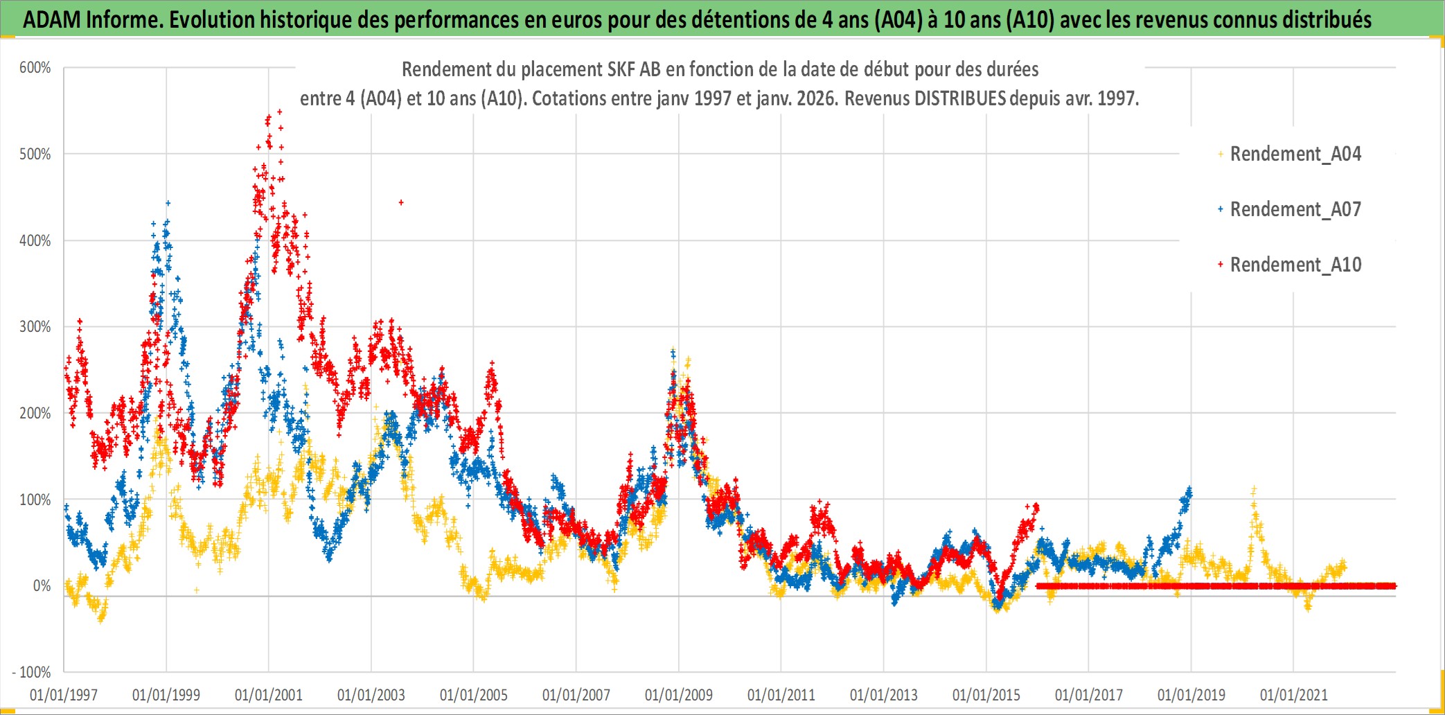 Site dédié aux investisseursPage dédiée sur site financeAnalyse des valorisations hebdomadaires de l'action SKF AB. Cet actif est cote en SEK. Les valorisations sont en contrevaleur EURO et couvrent les semaines 1997W01 a 2026W01. Les revenus de cet actif financier sont pris en compte depuis la semaine 1997W16. La note globale ESG de cet actif est estimee a 8.0 (apres rebasage entre 0 et 20).