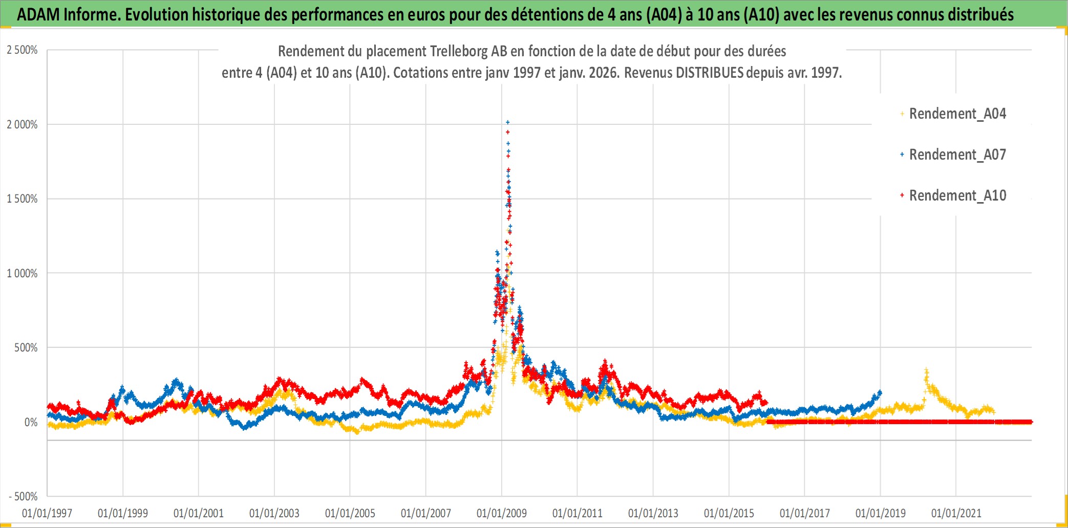 Site dédié aux investisseursPage dédiée sur site financeAnalyse des valorisations hebdomadaires de l'action Trelleborg AB. Cet actif est cote en SEK. Les valorisations sont en contrevaleur EURO et couvrent les semaines 1997W01 a 2026W01. Les revenus de cet actif financier sont pris en compte depuis la semaine 1997W18. La note globale ESG de cet actif est estimee a 6.0 (apres rebasage entre 0 et 20).