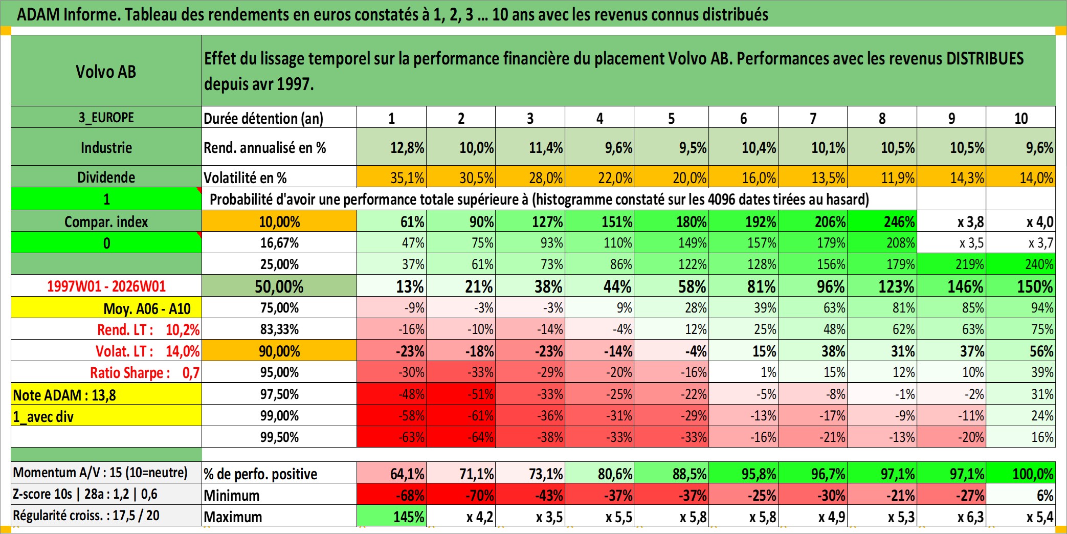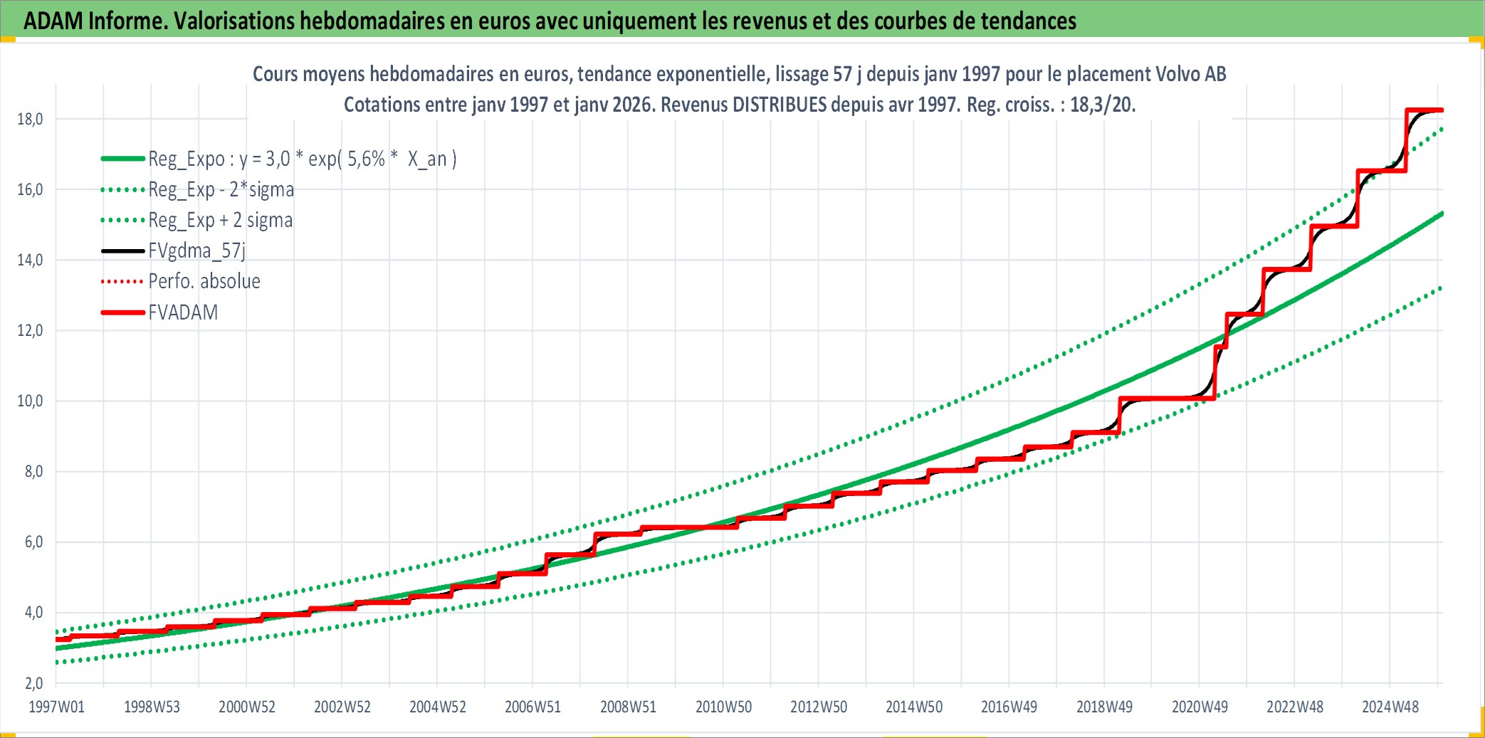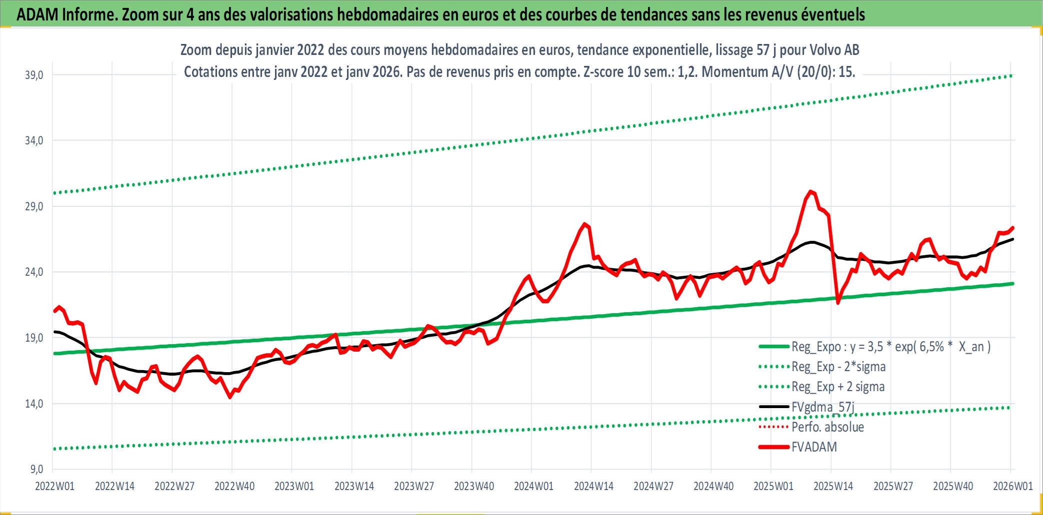 Site dédié aux investisseursPage dédiée sur site financeAnalyse des valorisations hebdomadaires de l'action Volvo AB. Cet actif est cote en SEK. Les valorisations sont en contrevaleur EURO et couvrent les semaines 1997W01 a 2026W01. Les revenus de cet actif financier sont pris en compte depuis la semaine 1997W17. La note globale ESG de cet actif est estimee a 9.0 (apres rebasage entre 0 et 20).
