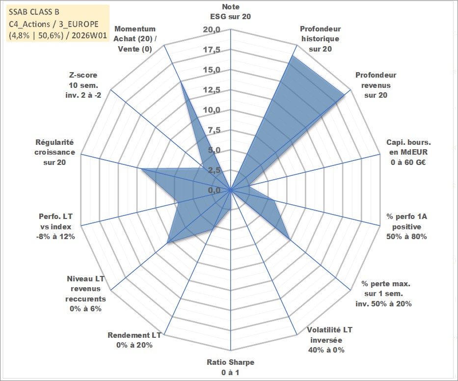 Site dédié aux investisseursPage dédiée sur site financeAnalyse des valorisations hebdomadaires de l'action SSAB CLASS B. Cet actif est cote en SEK. Les valorisations sont en contrevaleur EURO et couvrent les semaines 2000W01 a 2026W01. Les revenus de cet actif financier sont pris en compte depuis la semaine 2000W17. La note ESG de cet actif n'est pas connue.