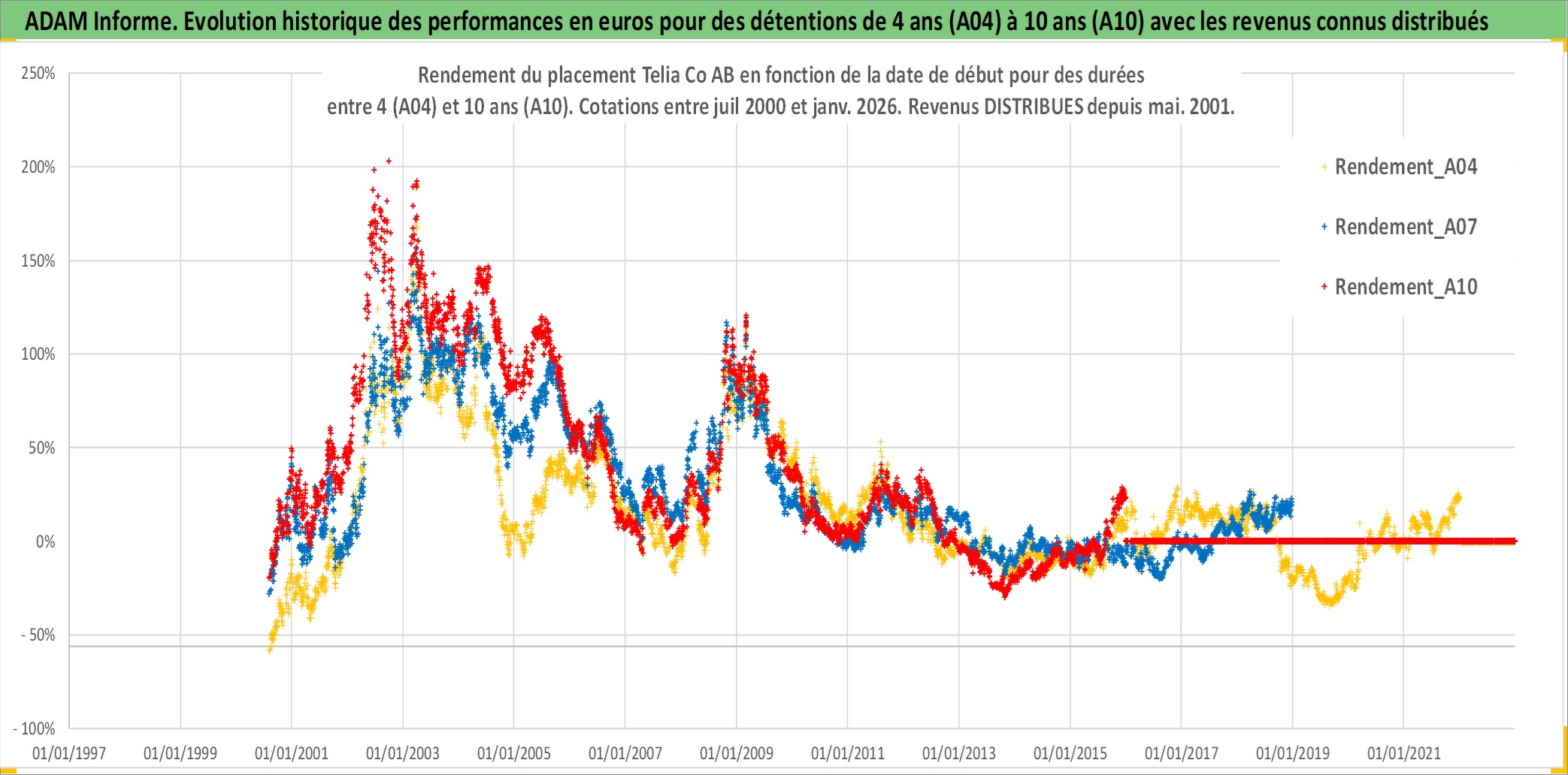 Site dédié aux investisseursPage dédiée sur site financeAnalyse des valorisations hebdomadaires de l'action Telia Co AB. Cet actif est cote en SEK. Les valorisations sont en contrevaleur EURO et couvrent les semaines 2000W30 a 2026W01. Les revenus de cet actif financier sont pris en compte depuis la semaine 2001W19. La note globale ESG de cet actif est estimee a 11.0 (apres rebasage entre 0 et 20).