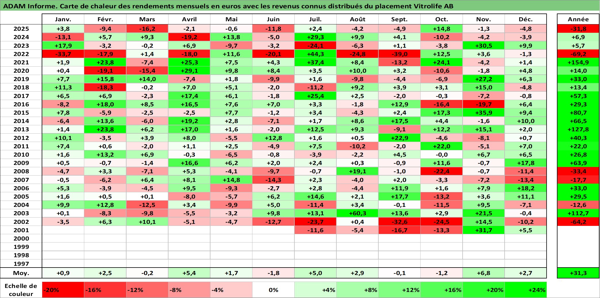 Site dédié aux investisseursPage dédiée sur site financeAnalyse des valorisations hebdomadaires de l'action Vitrolife AB. Cet actif est cote en SEK. Les valorisations sont en contrevaleur EURO et couvrent les semaines 2001W26 a 2026W01. Les revenus de cet actif financier sont pris en compte depuis la semaine 2009W18. La note ESG de cet actif n'est pas connue.