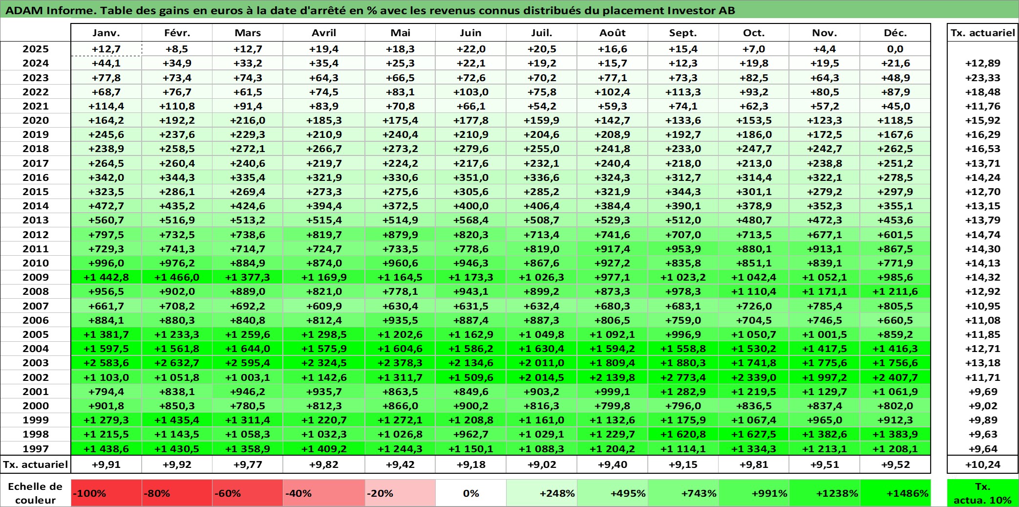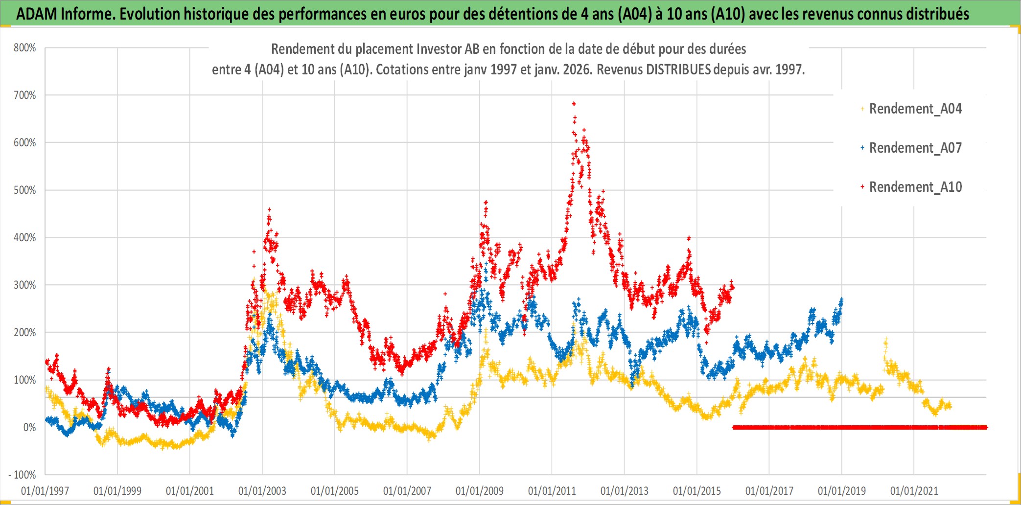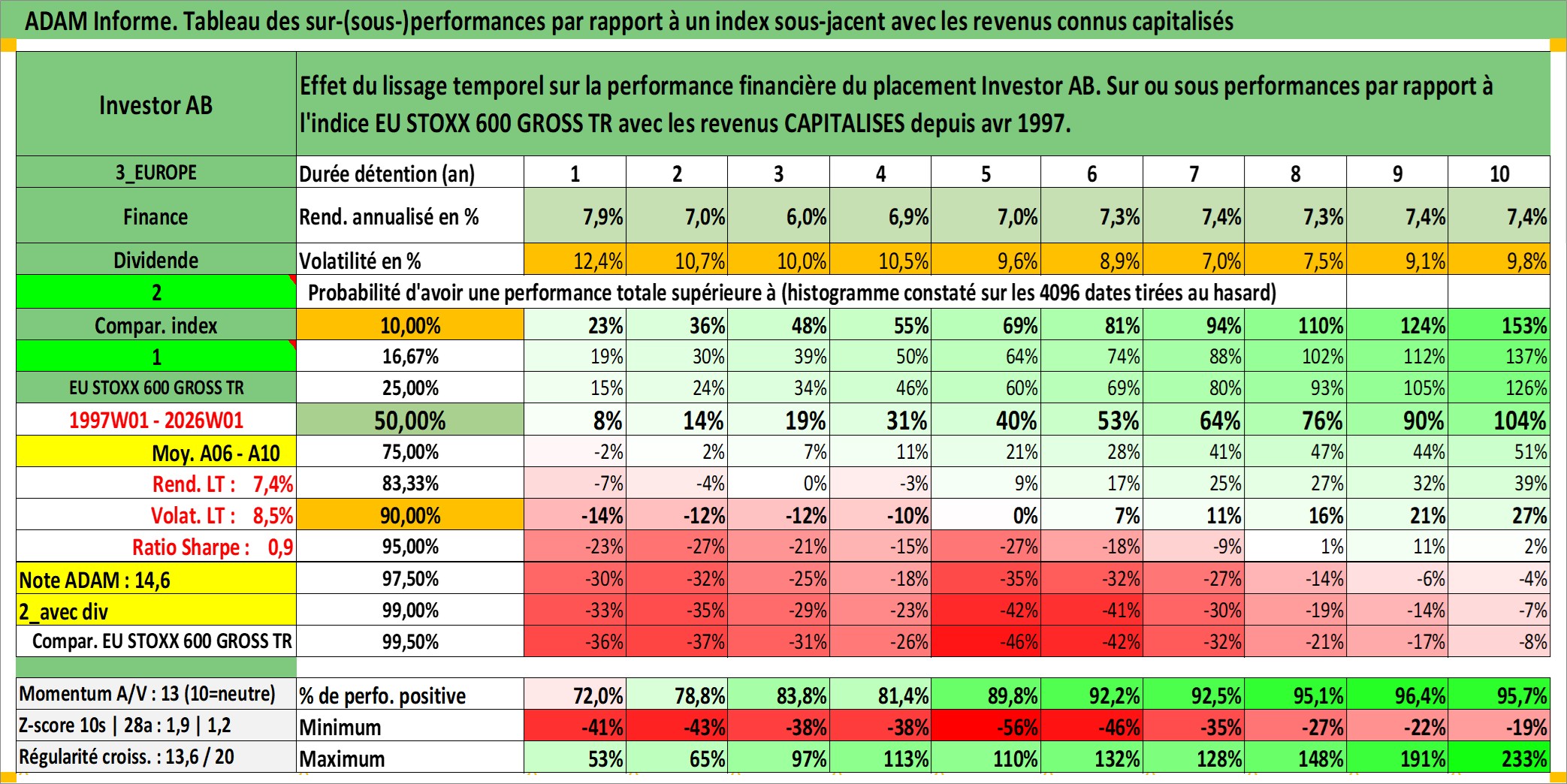Site dédié aux investisseursPage dédiée sur site financeAnalyse des valorisations hebdomadaires de l'action Investor AB. Cet actif est cote en SEK. Les valorisations sont en contrevaleur EURO et couvrent les semaines 1997W01 a 2026W01. Les revenus de cet actif financier sont pris en compte depuis la semaine 1997W16. La note globale ESG de cet actif est estimee a 18.0 (apres rebasage entre 0 et 20).