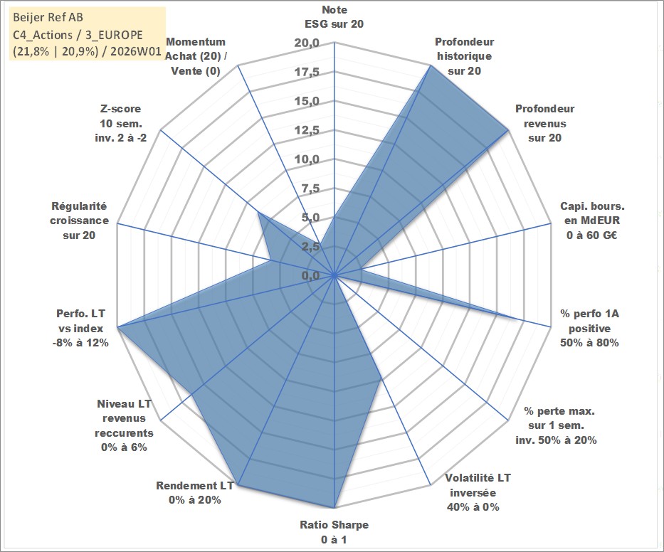Site dédié aux investisseursPage dédiée sur site financeAnalyse des valorisations hebdomadaires de l'action Beijer Ref AB. Cet actif est cote en SEK. Les valorisations sont en contrevaleur EURO et couvrent les semaines 1997W01 a 2026W01. Les revenus de cet actif financier sont pris en compte depuis la semaine 1997W17. La note globale ESG de cet actif est estimee a 5.0 (apres rebasage entre 0 et 20).