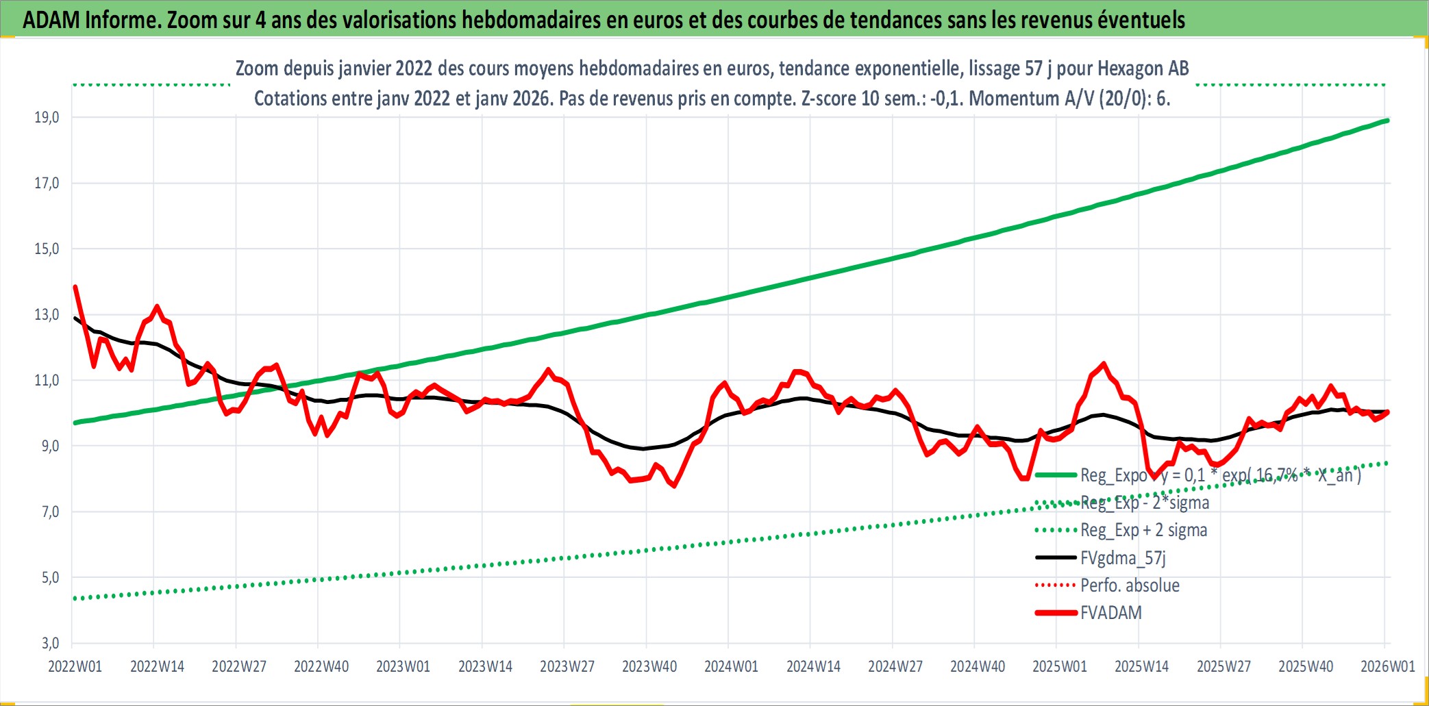 Site dédié aux investisseursPage dédiée sur site financeAnalyse des valorisations hebdomadaires de l'action Hexagon AB. Cet actif est cote en SEK. Les valorisations sont en contrevaleur EURO et couvrent les semaines 1997W01 a 2026W01. Les revenus de cet actif financier sont pris en compte depuis la semaine 1997W19. La note globale ESG de cet actif est estimee a 15.0 (apres rebasage entre 0 et 20).