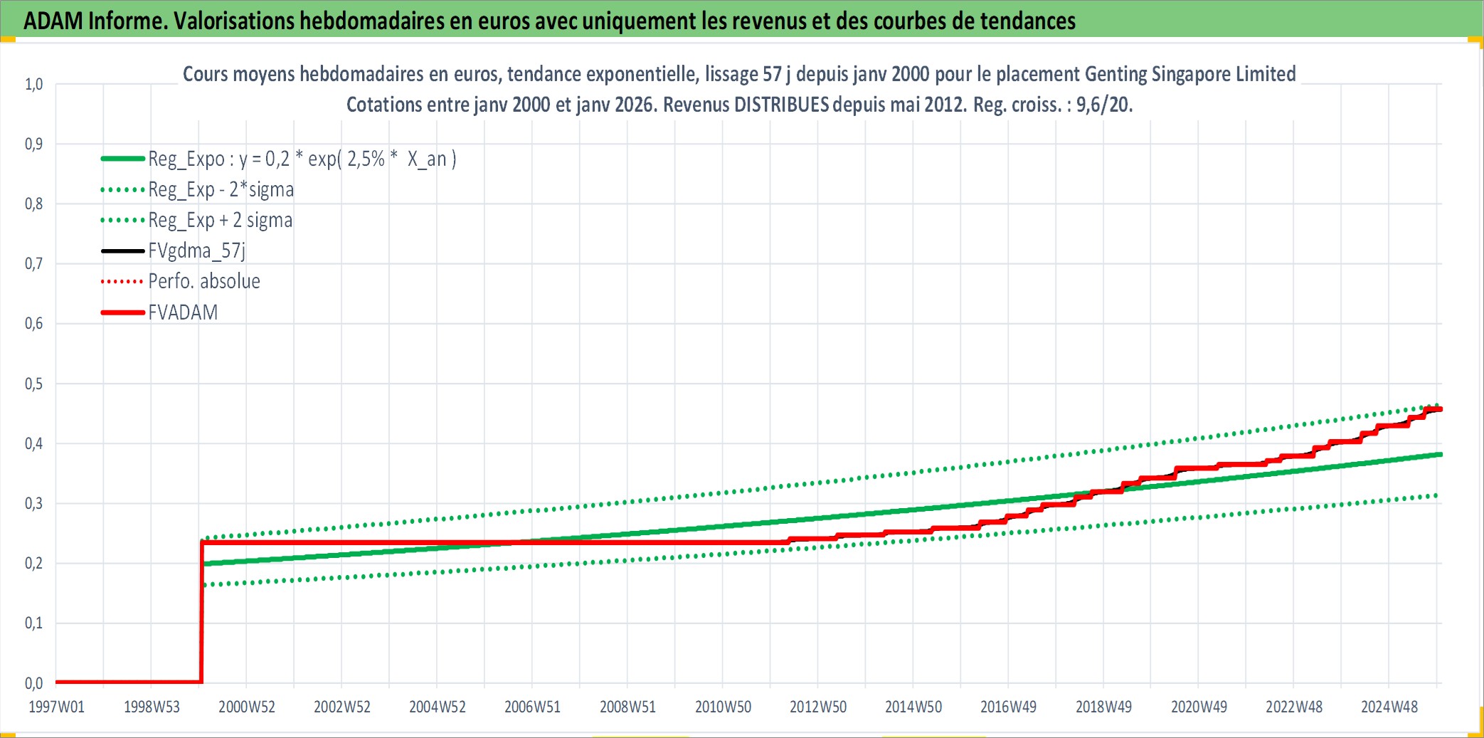 Site dédié aux investisseursPage dédiée sur site financeAnalyse des valorisations hebdomadaires de l'action Genting Singapore Limited. Cet actif est cote en SGD. Les valorisations sont en contrevaleur EURO et couvrent les semaines 2000W03 a 2026W01. Les revenus de cet actif financier sont pris en compte depuis la semaine 2012W19. La note globale ESG de cet actif est estimee a 10.0 (apres rebasage entre 0 et 20).