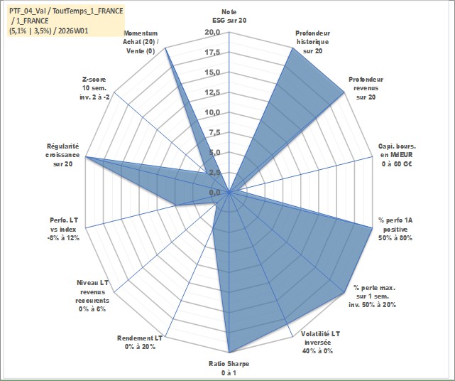 Site dédié aux investisseursPage dédiée sur site financeAnalyse des valorisations hebdomadaires du portefeuille ToutTemps_1_FRANCE_4actifs avec un profil P6_PurActions. Ce portefeuille est cote en EUR. Les valorisations couvrent les semaines 1997W01 a 2026W01. Les revenus de cet actif financier sont pris en compte depuis la semaine 1997W01. La note ESG de cet actif n'est pas connue.