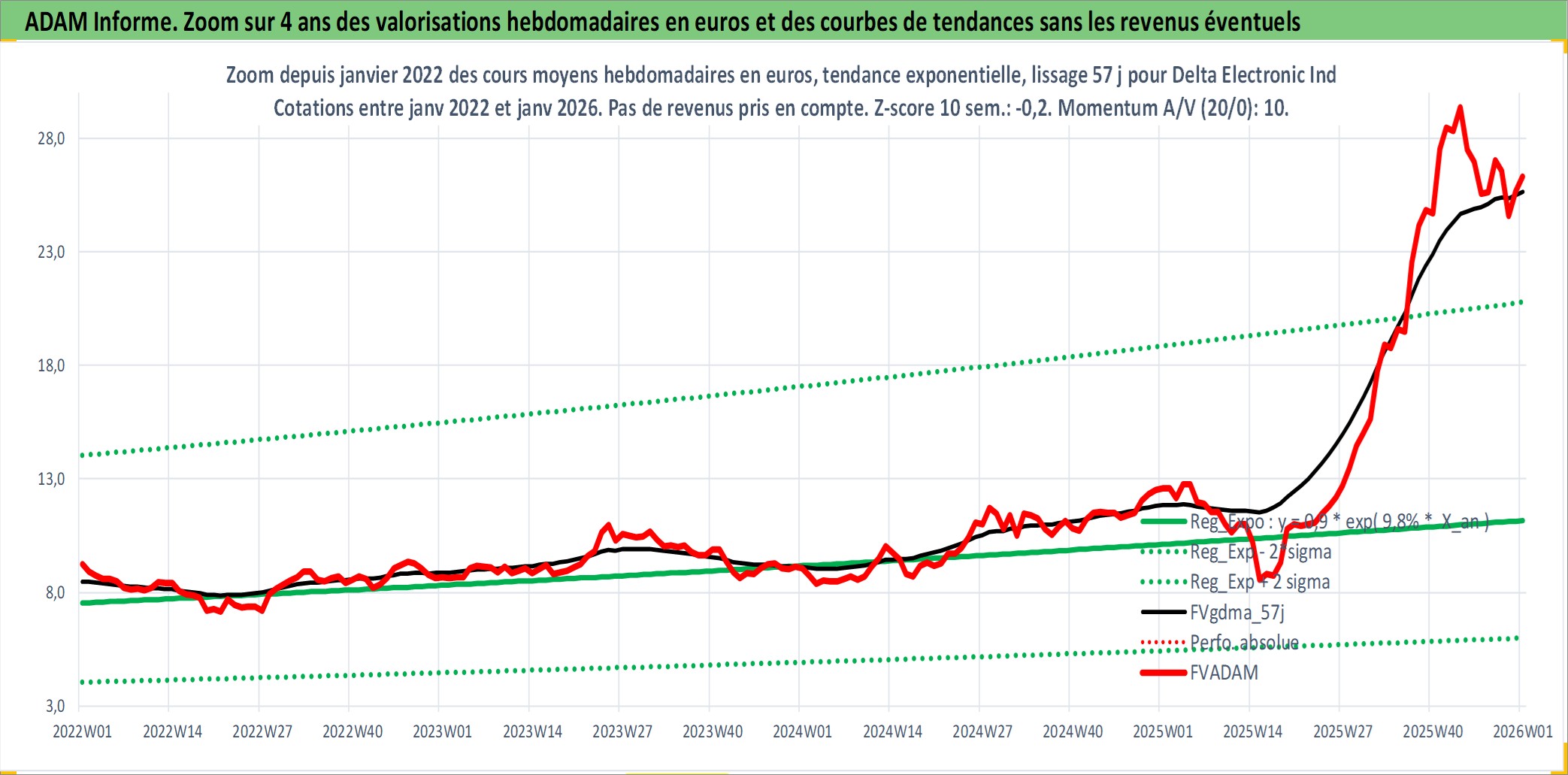 Site dédié aux investisseursPage dédiée sur site financeAnalyse des valorisations hebdomadaires de l'action Delta Electronic Ind . Cet actif est cote en TWD. Les valorisations sont en contrevaleur EURO et couvrent les semaines 2000W15 a 2026W01. Les revenus de cet actif financier sont pris en compte depuis la semaine 2000W28. La note globale ESG de cet actif est estimee a 11.0 (apres rebasage entre 0 et 20).
