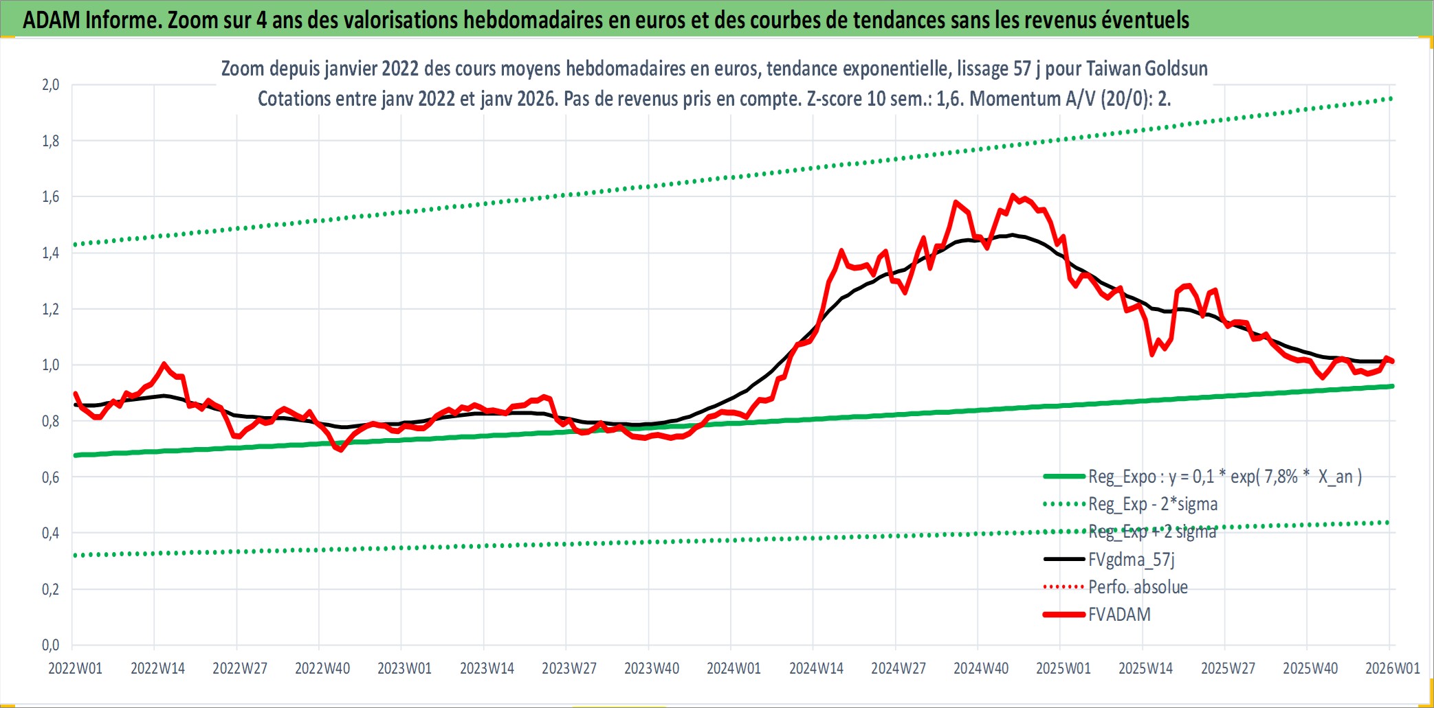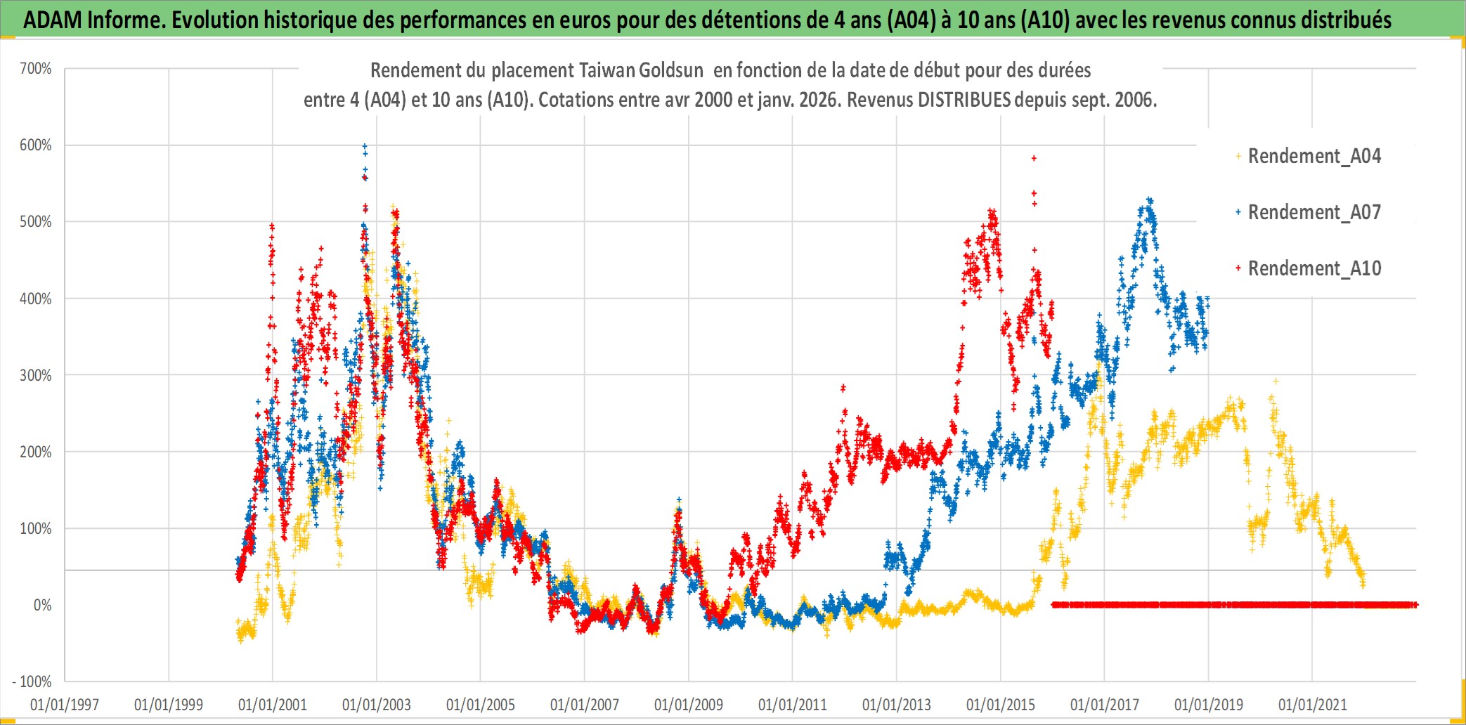Site dédié aux investisseursPage dédiée sur site financeAnalyse des valorisations hebdomadaires de l'action Taiwan Goldsun . Cet actif est cote en TWD. Les valorisations sont en contrevaleur EURO et couvrent les semaines 2000W15 a 2026W01. Les revenus de cet actif financier sont pris en compte depuis la semaine 2006W37. La note ESG de cet actif n'est pas connue.