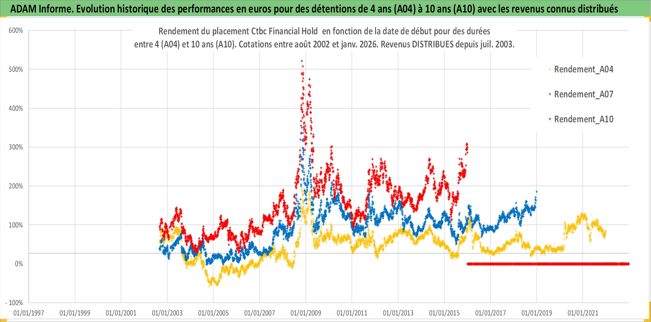 Site dédié aux investisseursPage dédiée sur site financeAnalyse des valorisations hebdomadaires de l'action Ctbc Financial Hold . Cet actif est cote en TWD. Les valorisations sont en contrevaleur EURO et couvrent les semaines 2002W34 a 2026W01. Les revenus de cet actif financier sont pris en compte depuis la semaine 2003W27. La note globale ESG de cet actif est estimee a 10.0 (apres rebasage entre 0 et 20).
