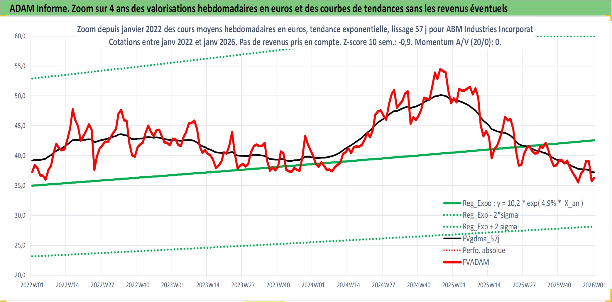 Site dédié aux investisseursPage dédiée sur site financeAnalyse des valorisations hebdomadaires de l'action ABM Industries Incorporated. Cet actif est cote en USD. Les valorisations sont en contrevaleur EURO et couvrent les semaines 1997W01 a 2026W01. Les revenus de cet actif financier sont pris en compte depuis la semaine 1997W03. La note ESG de cet actif n'est pas connue.
