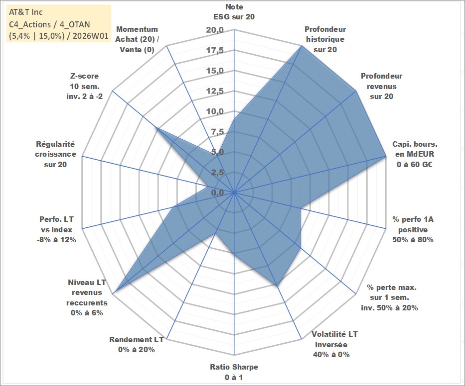 Site dédié aux investisseursPage dédiée sur site financeAnalyse des valorisations hebdomadaires de l'action AT&T Inc. Cet actif est cote en USD. Les valorisations sont en contrevaleur EURO et couvrent les semaines 1997W01 a 2026W01. Les revenus de cet actif financier sont pris en compte depuis la semaine 1997W02. La note globale ESG de cet actif est estimee a 9.0 (apres rebasage entre 0 et 20).