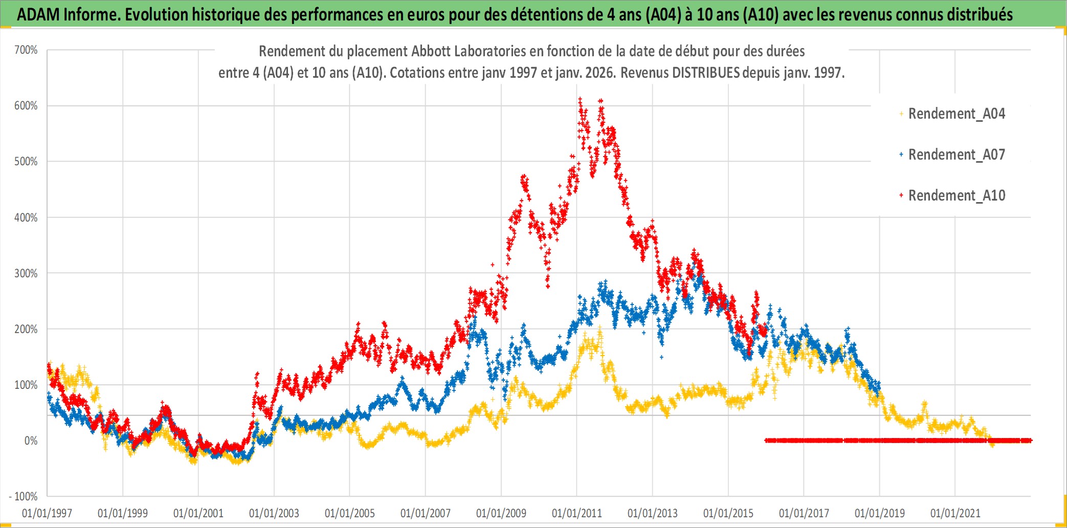 Site dédié aux investisseursPage dédiée sur site financeAnalyse des valorisations hebdomadaires de l'action Abbott Laboratories. Cet actif est cote en USD. Les valorisations sont en contrevaleur EURO et couvrent les semaines 1997W01 a 2026W01. Les revenus de cet actif financier sont pris en compte depuis la semaine 1997W03. La note globale ESG de cet actif est estimee a 7.0 (apres rebasage entre 0 et 20).