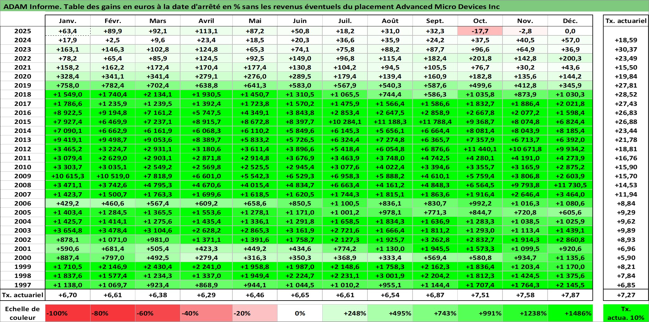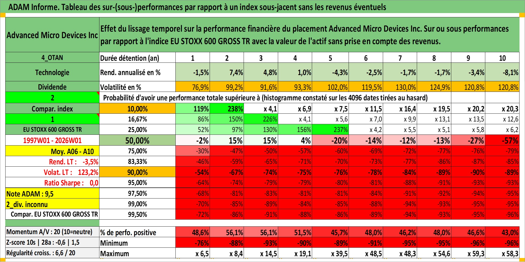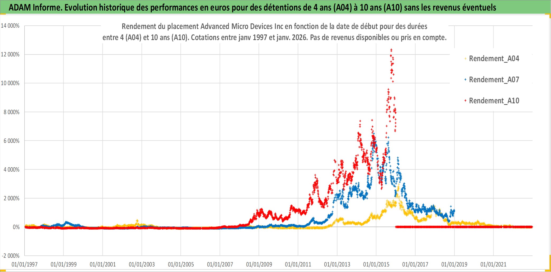 Site dédié aux investisseursPage dédiée sur site financeAnalyse des valorisations hebdomadaires de l'action Advanced Micro Devices Inc. Cet actif est cote en USD. Les valorisations sont en contrevaleur EURO et couvrent les semaines 1997W01 a 2026W01. Les revenus de cet actif financier ne sont pas connus car non existants ou non disponibles sur le site Yahoo Finance. La note ESG de cet actif n'est pas connue.