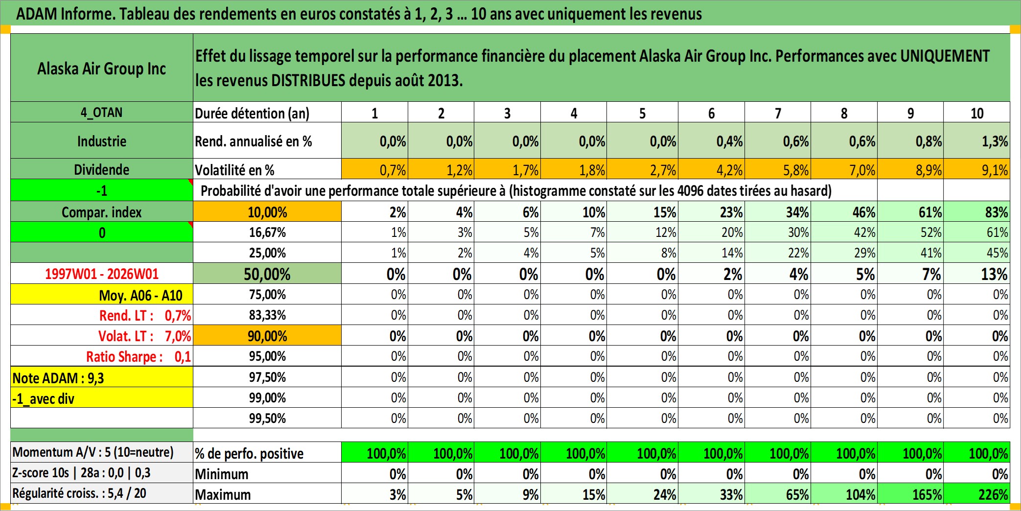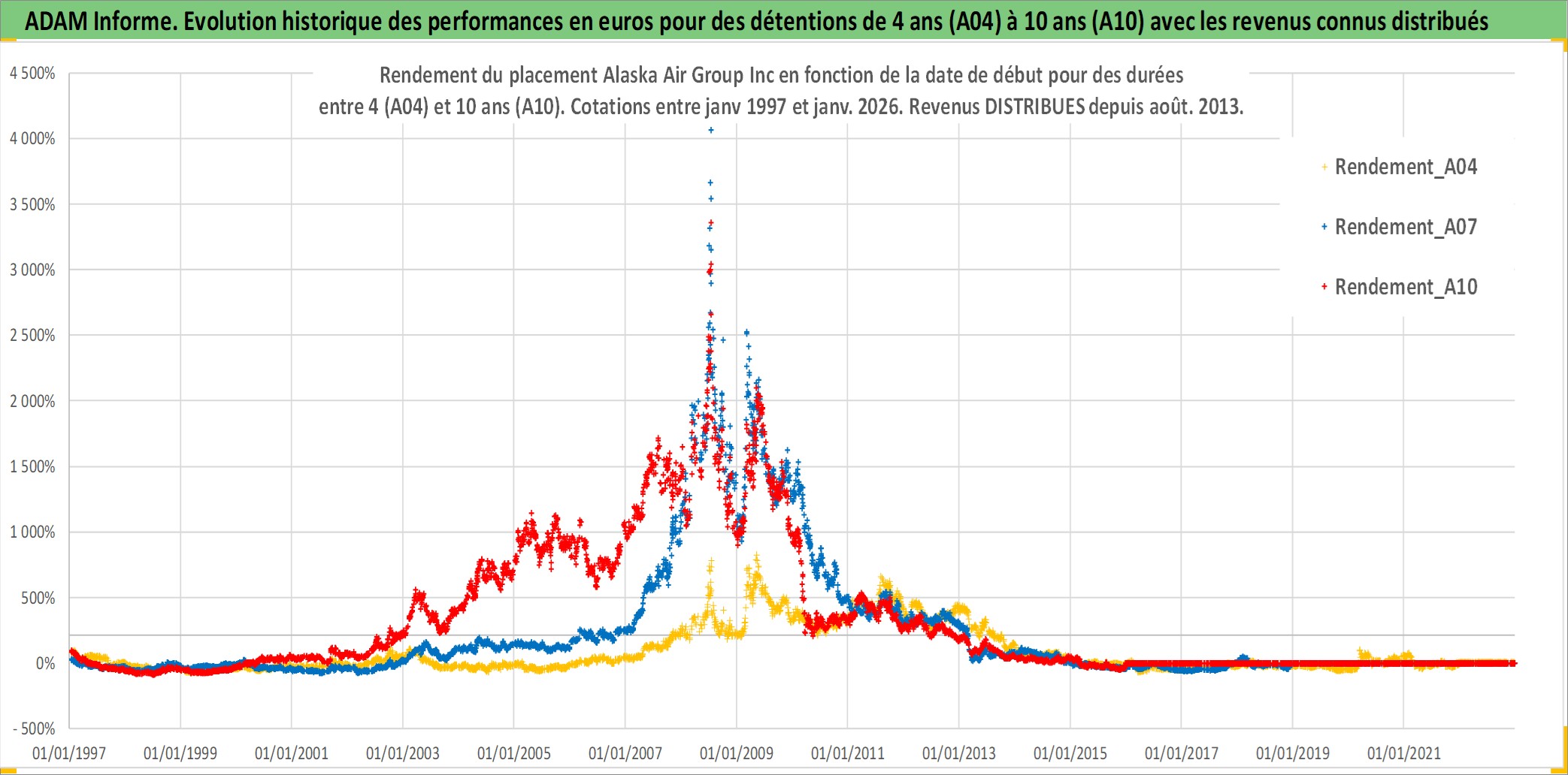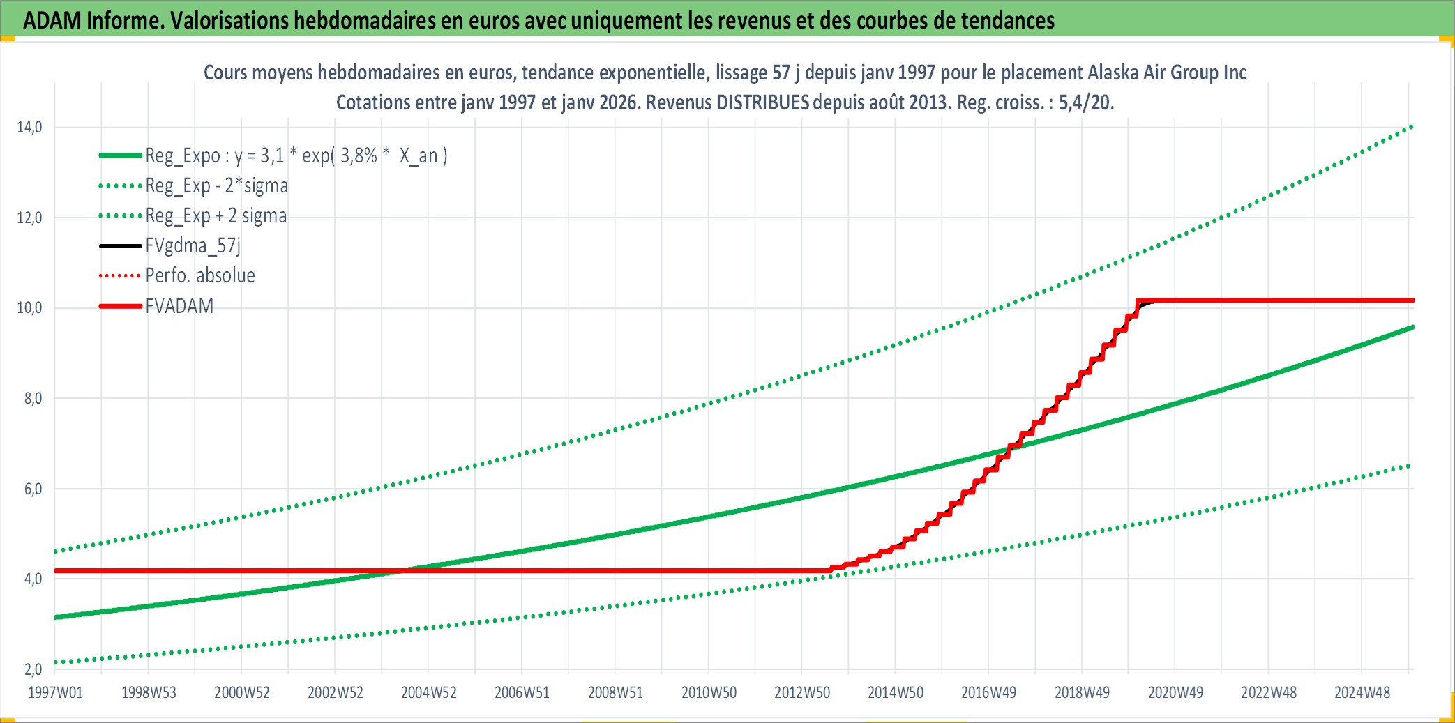 Site dédié aux investisseursPage dédiée sur site financeAnalyse des valorisations hebdomadaires de l'action Alaska Air Group Inc. Cet actif est cote en USD. Les valorisations sont en contrevaleur EURO et couvrent les semaines 1997W01 a 2026W01. Les revenus de cet actif financier sont pris en compte depuis la semaine 2013W31. La note ESG de cet actif n'est pas connue.