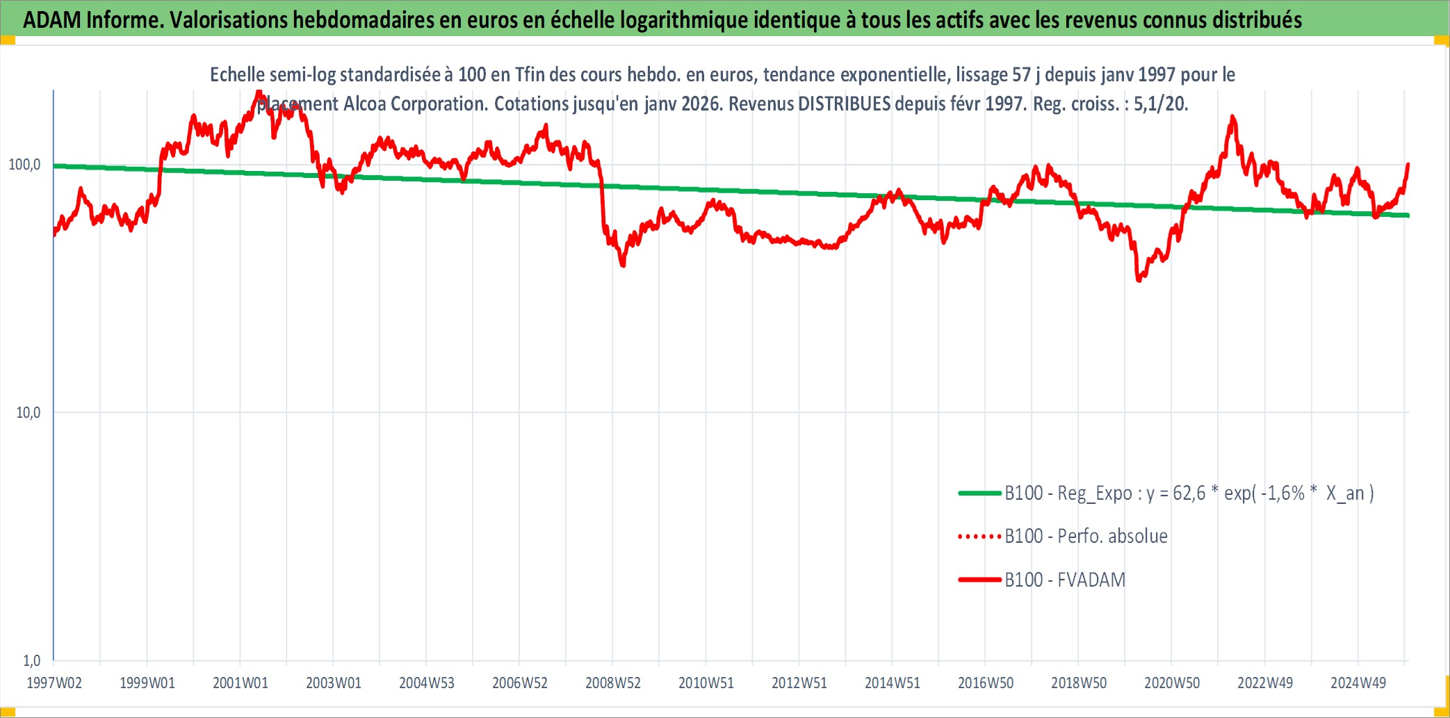Site dédié aux investisseursPage dédiée sur site financeAnalyse des valorisations hebdomadaires de l'action Alcoa Corporation. Cet actif est cote en USD. Les valorisations sont en contrevaleur EURO et couvrent les semaines 1997W01 a 2026W01. Les revenus de cet actif financier sont pris en compte depuis la semaine 1997W06. La note globale ESG de cet actif est estimee a 8.0 (apres rebasage entre 0 et 20).