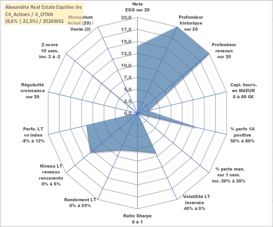 Site dédié aux investisseursPage dédiée sur site financeAnalyse des valorisations hebdomadaires de l'action Alexandria Real Estate Equities Inc. Cet actif est cote en USD. Les valorisations sont en contrevaleur EURO et couvrent les semaines 1997W22 a 2026W01. Les revenus de cet actif financier sont pris en compte depuis la semaine 1998W14. La note globale ESG de cet actif est estimee a 14.0 (apres rebasage entre 0 et 20).