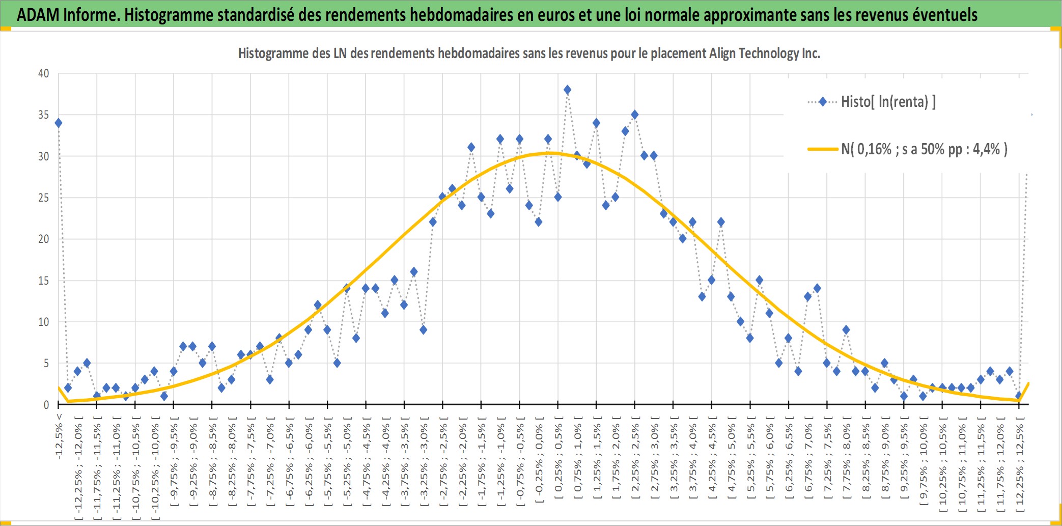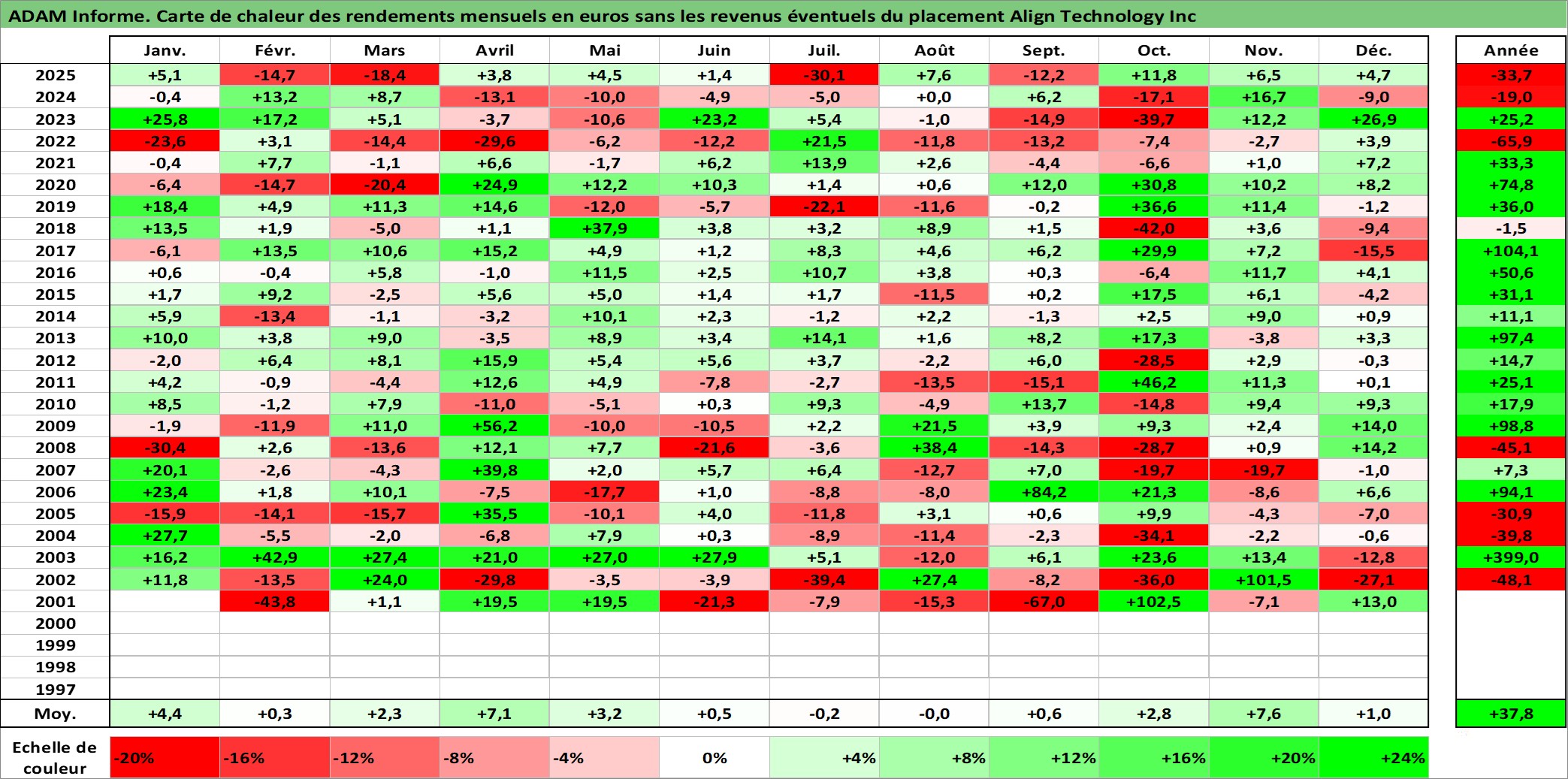 Site dédié aux investisseursPage dédiée sur site financeAnalyse des valorisations hebdomadaires de l'action Align Technology Inc. Cet actif est cote en USD. Les valorisations sont en contrevaleur EURO et couvrent les semaines 2001W04 a 2026W01. Les revenus de cet actif financier ne sont pas connus car non existants ou non disponibles sur le site Yahoo Finance. La note ESG de cet actif n'est pas connue.