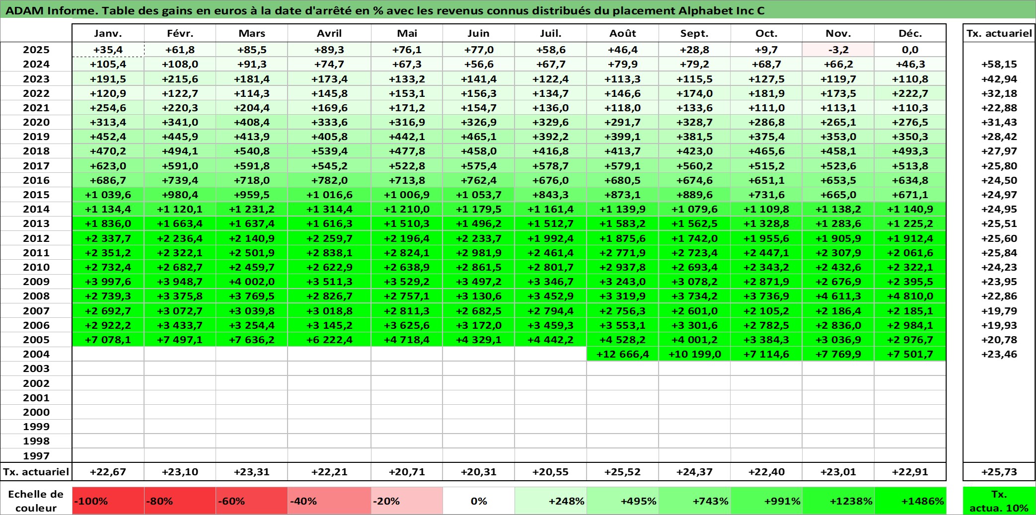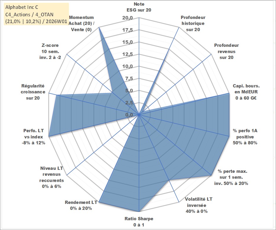 Site dédié aux investisseursPage dédiée sur site financeAnalyse des valorisations hebdomadaires de l'action Alphabet Inc C. Cet actif est cote en USD. Les valorisations sont en contrevaleur EURO et couvrent les semaines 2004W34 a 2026W01. Les revenus de cet actif financier sont pris en compte depuis la semaine 2024W24. La note ESG de cet actif n'est pas connue.