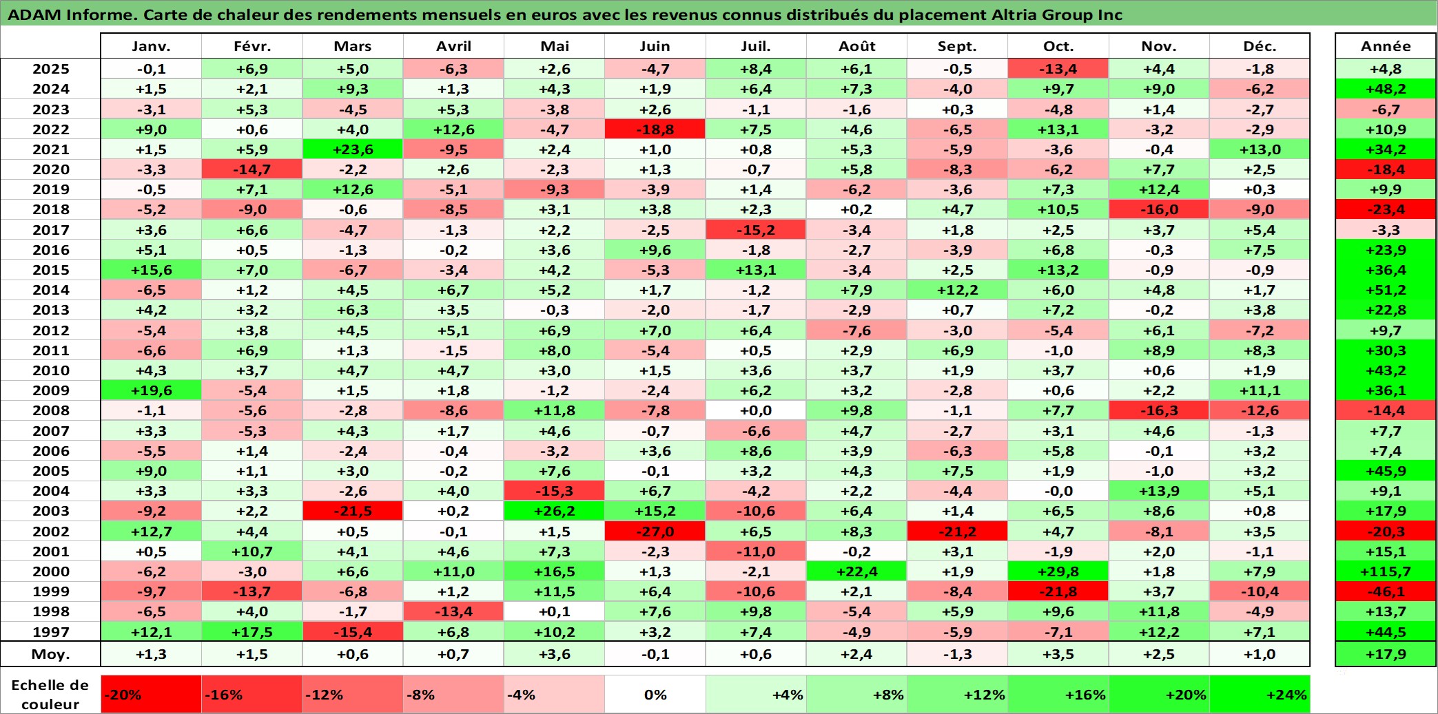 Site dédié aux investisseursPage dédiée sur site financeAnalyse des valorisations hebdomadaires de l'action Altria Group Inc. Cet actif est cote en USD. Les valorisations sont en contrevaleur EURO et couvrent les semaines 1997W01 a 2026W01. Les revenus de cet actif financier sont pris en compte depuis la semaine 1997W11. La note globale ESG de cet actif est estimee a 8.0 (apres rebasage entre 0 et 20).